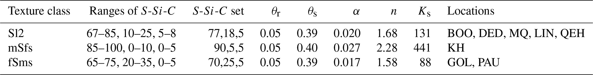 Finally, soil hydraulic parameters (SHP) had to be set in order to represent the relationship between matric potential (ψ, hPa) and volumetric soil water content (SWC, m3 m−3) as well as hydraulic conductivity (Ks, cm d−1). Using the model of van Genuchten and Mualem (van Genuchten1980), the SHP correspond to five parameters: residual water content (θr, m3 m−3), saturated water content (θs, m3 m−3), air entry point (α, cm−1), the shape parameter of the retention curve (n, dimensionless), and the saturated hydraulic conductivity Ks (cm d−1). To obtain SHP values at the monitoring locations, we applied the widely used pedotansfer function ROSETTA (Schaap et al.2001). As input, ROSETTA requires the fractions of sand, silt and clay, which were obtained from the texture attribute of the state's soil map BUEK300 (LBGR2024, see also Table 1). This soil map, however, only represents a qualitative soil texture class which, in turn, implies typical ranges of sand (S), silt (Si) and clay (C) content according to BGR (2005). For the uncalibrated model, we fixed C to a value of 5 % and set S as the midpoint of the range of sand content as specified by the soil map. Si then equalled the remainder to 100 %. Table 3 shows the values for S, Si, and C for each of the three soil texture classes considered in our study, as well as the corresponding SHP values. Please see Sect. 2.5 on how the model was calibrated for each monitoring location.