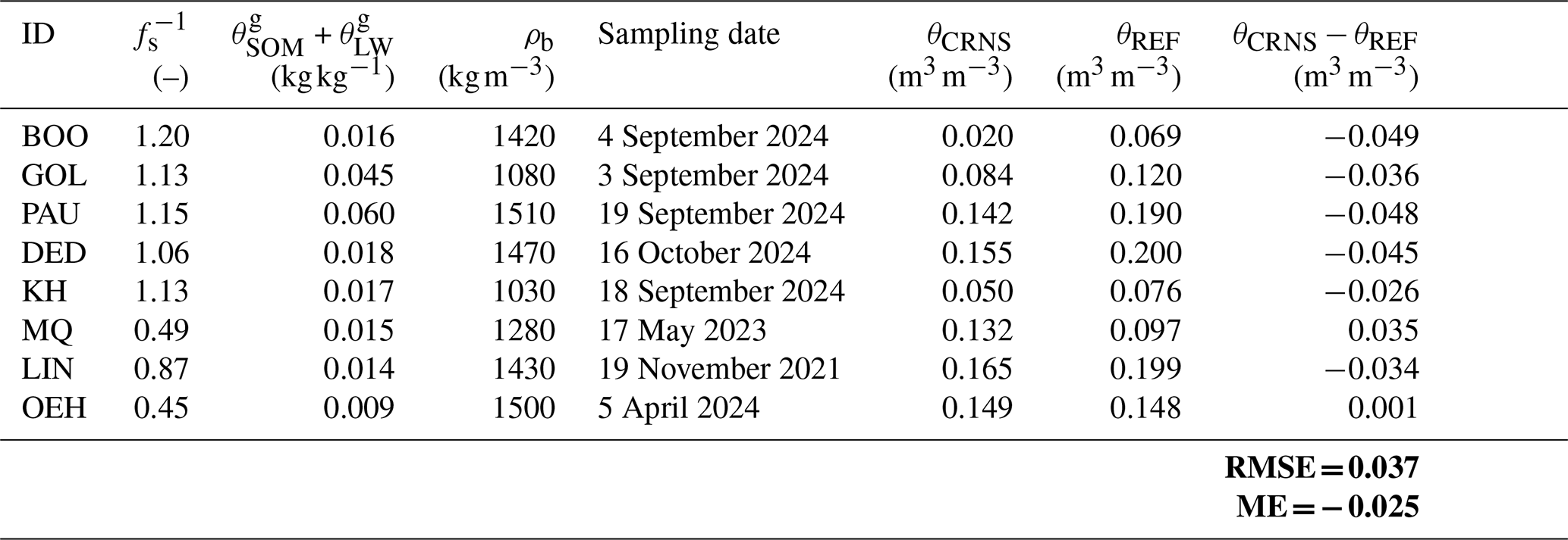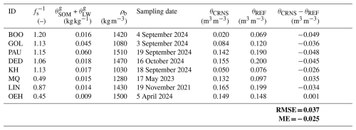 Table 4Parameters for CRNS-based SWC estimation (see main text), θCRNS and θREF at the sampling dates and the corresponding difference θCRNSθREF between these values. The bold expressions specify the root mean squared error (RMSE) and the mean error (ME) that result from the differences of all eight monitoring stations.