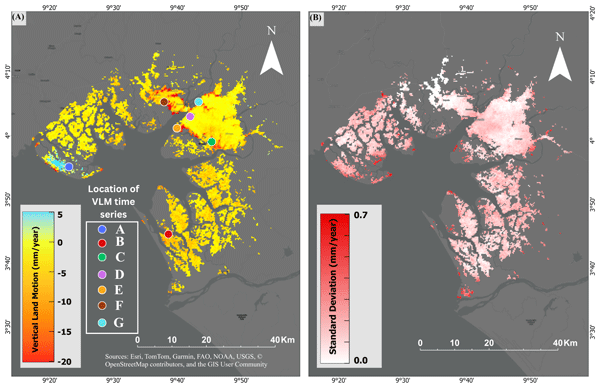 Figure 5VLM referenced to IGS1G and associated uncertainty derived from Sentinel-1 InSAR data over the Douala coastland. (A) Mean VLM rates (in mm yr−1), where negative values (yellow to red) indicate land subsidence and positive values (blue) indicate shallow uplift. (B) Standard deviation of the VLM estimates, illustrating the spatial variability of measurement uncertainty.