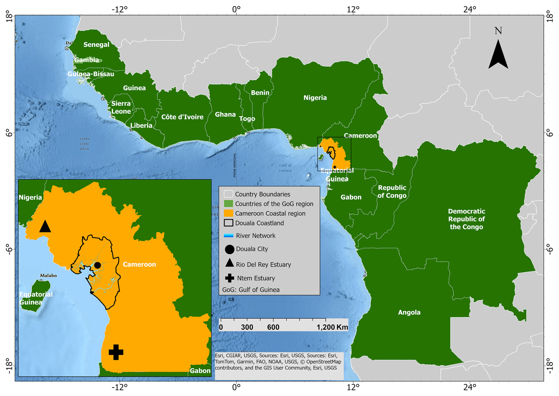 Figure 1Countries of the Gulf of Guinea region bordering the Atlantic Ocean. The coastline of Cameroon is bounded by the Ntem estuary in the southeast and the Rio Del Rey estuary in the northwest. The inset shows the study area (Douala Coastland), Douala City, and Rio Del Rey. Basemap source: Esri.