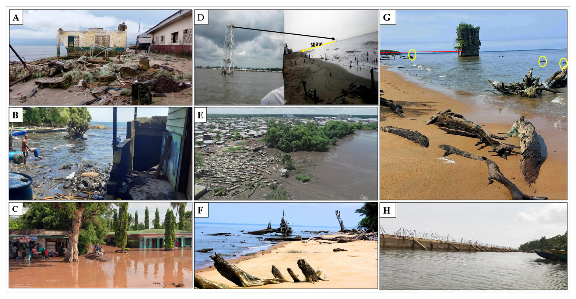 Figure 2Environmental hazards along the low-lying coast of Cameroon. (A) Destruction of school infrastructure due to intensified coastal erosion as a result of sea-level rise in Bakassi, Rio Del Rey Estuary (Wantim and Ngeh Ngeh, 2025). (B) Destruction of houses by sea-level rise and coastal erosion in Desbundscha (Wantim et al., 2021). (C) Flooding in coastal city along the Gulf of Guinea (Editor, 2024). (D) Shift of the coastline by 300 m over 30 years on Cap Cameroon Island (Fossi et al., 2019). (E) Shoreline retreat in Douala as a result of relative sea-level rise (Sikem, 2021). Panels (F)–(H) highlight the exposure of Manoka Island to sea-level rise, coastal erosion, and potential land subsidence. For (G), the yellow circle highlights a remaining tree trunk submerged in the waterbody, indicating that this area was previously emerged land. The red line indicates the distance between the current shoreline and the submerged building. (F–H) Photos taken in 2023 by author.