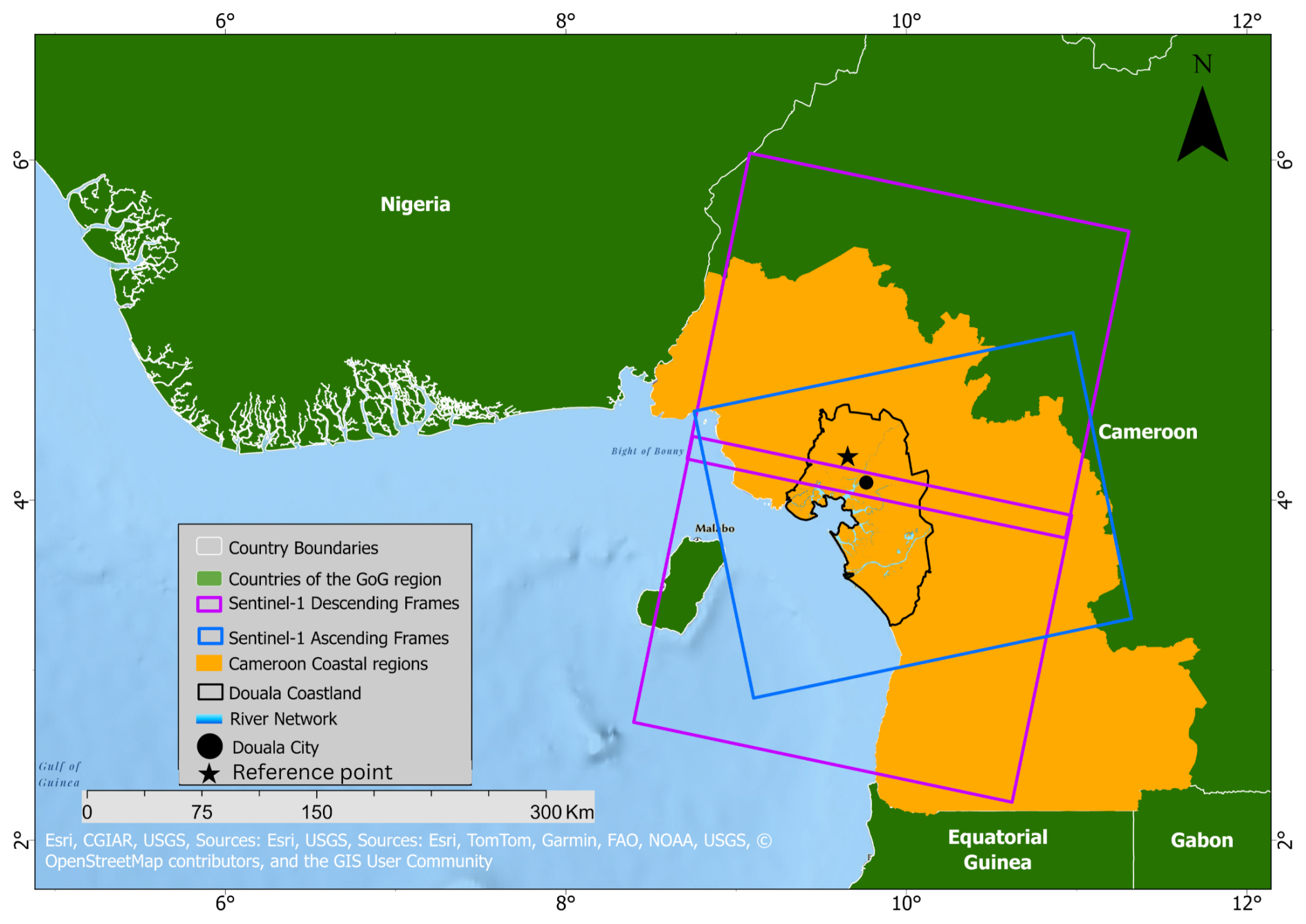 Figure 3Footprint of InSAR images (ascending and descending Sentinel-1A/B) in the Douala coastland, including the position of the local reference point. Basemap source: Esri.
