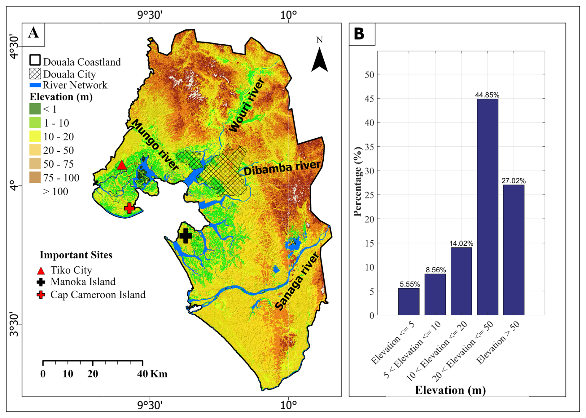 The Douala Coastland was delineated, covering a surface area of 2700 km2, with 4.5 % elevation below 5 m, 7 % elevation between 5 and 10 m, and 13 % elevation between 10 and 20 m above sea level (Fig. 4). Within this area, the city of Douala has key infrastructure, such as the Douala International Airport, the Douala seaport, and industrial plants. In addition, the study area includes the Douala Wetland area, Manoka Island, and Cap Cameroon Island, which appear to have very low elevations.