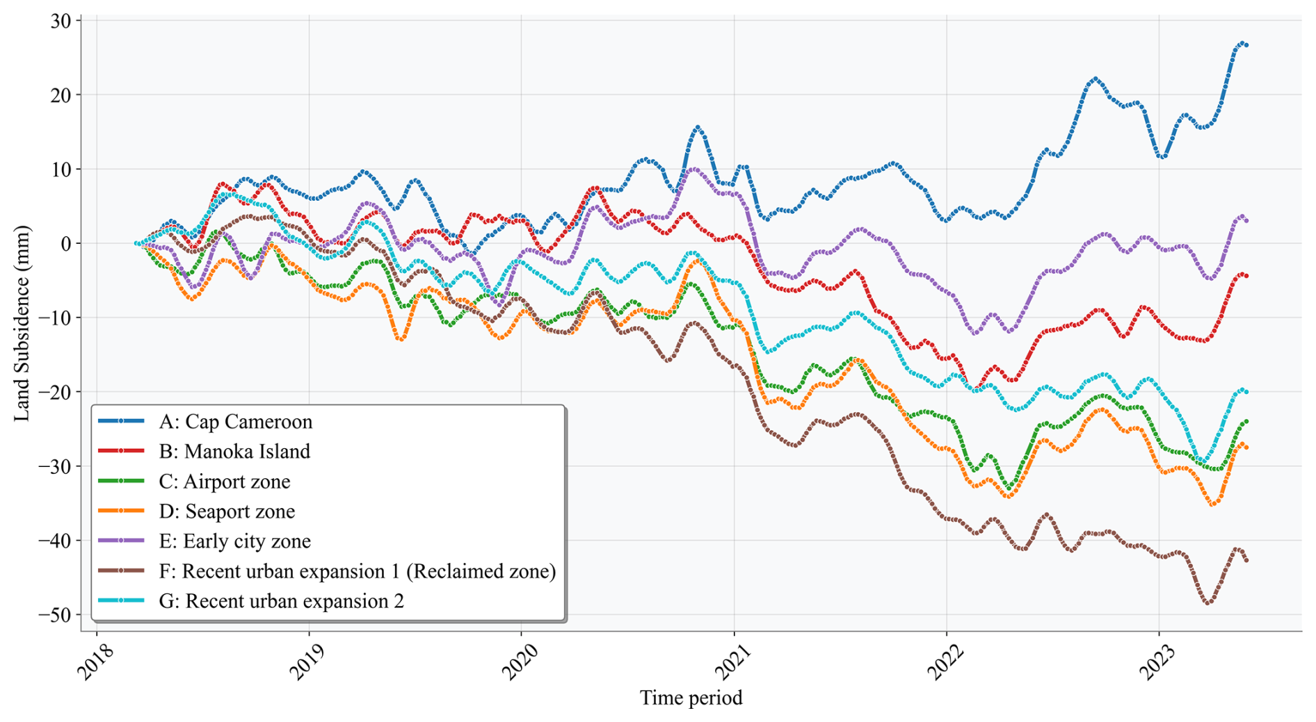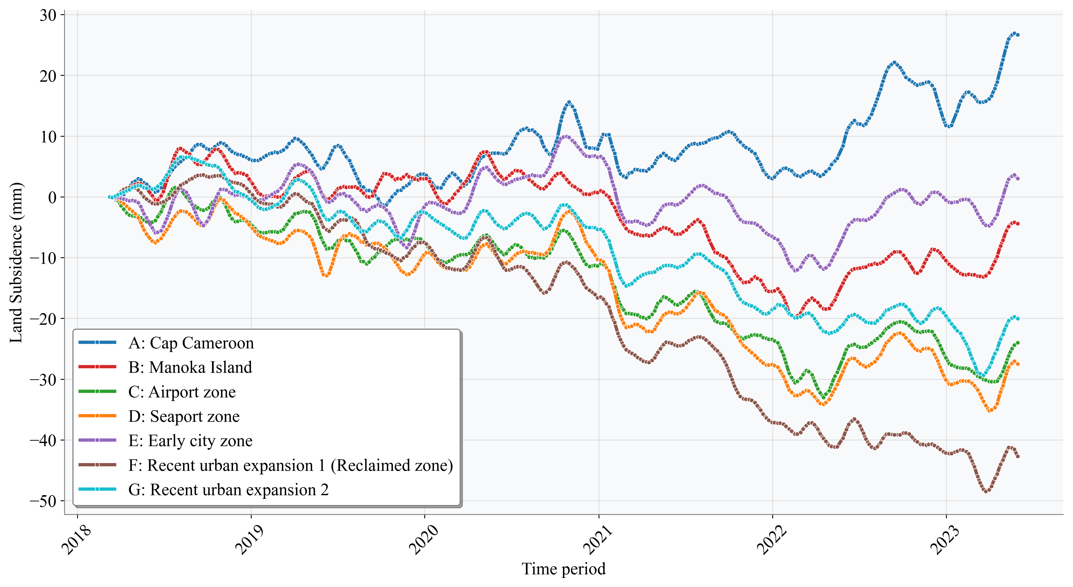 Across all seven selected sites in Douala in Fig. 6, land displacement between 2018 and 2023 reveals a clear spatial contrast between stable or uplifting natural/coastal zones and strongly subsiding reclaimed or heavily urbanized areas, as shown in Fig. 6. Cap Cameroon is the only location exhibiting sustained uplift, while Manoka Island and the early city zone show relatively minor subsidence, reflecting limited anthropogenic loading and more consolidated ground conditions. In contrast, the airport area, seaport zone, and especially the reclaimed urban expansion zones display progressive and substantial land subsidence in the most recently reclaimed area consistent with ongoing consolidation of fill material, heavy infrastructure loading, and groundwater variability.