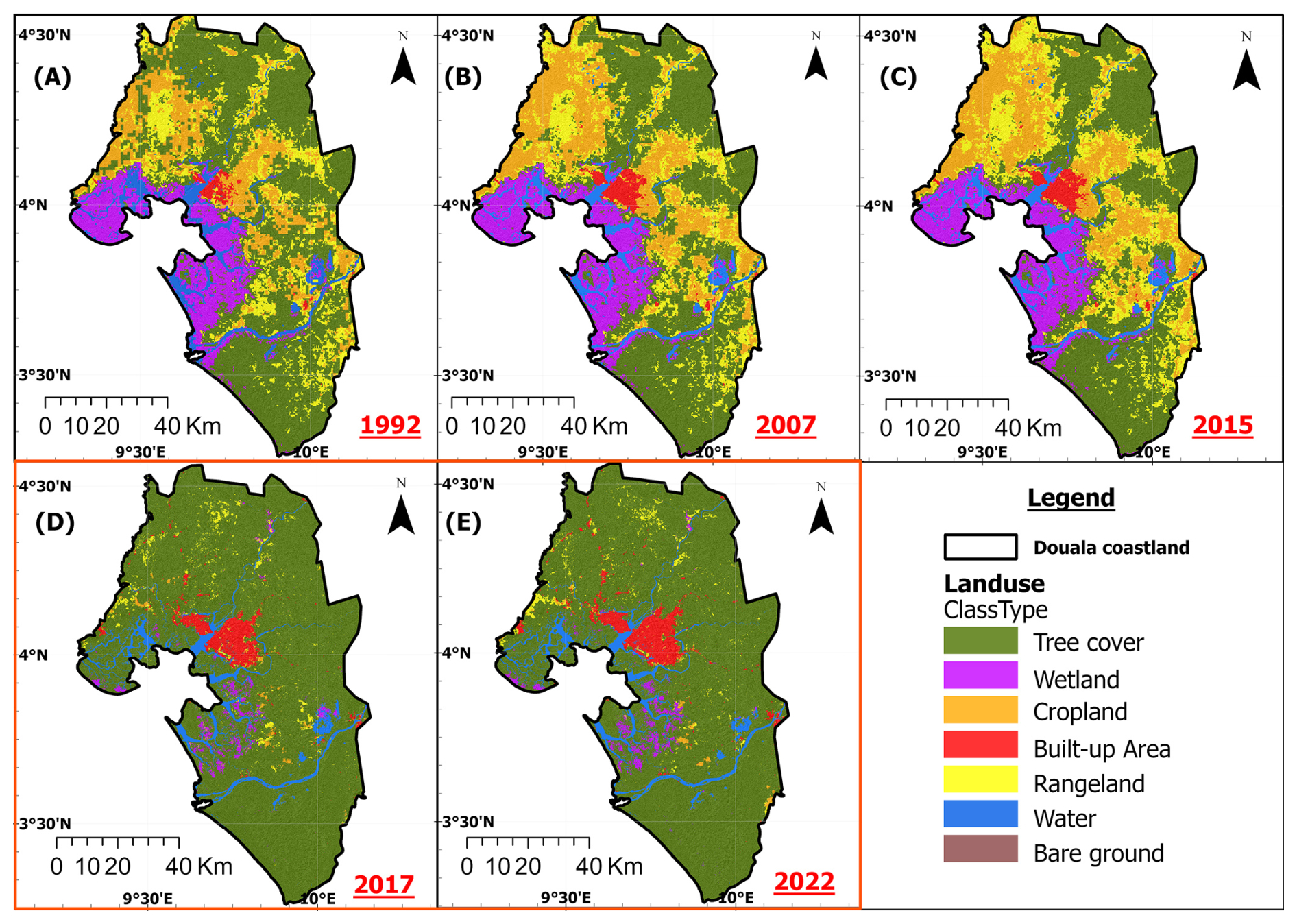 Figure 7Land use and land cover (LULC) of Douala coastland in (A) 1992, (B) 2007, (C) 2015, (D) 2017, and (E) 2022. Panels (A)–(C) were extracted from the European Space Agency (ESA) Global Land Cover Maps, Version 2.0.7 datasets with a resolution of 300 m × 300 m. Panels (D)–(E) were extracted from the Sentinel-2 10-Meter LULC and Esri Land Cover (Esri) datasets. Tree cover definitions differ between ESA (A–C) and ESRI (D, E): it represents significant clusters of tall (∼ 15 m or higher) dense vegetation, typically with a closed or dense canopy, for the former, and areas dominated by trees with > 10 % tree cover for the latter.
