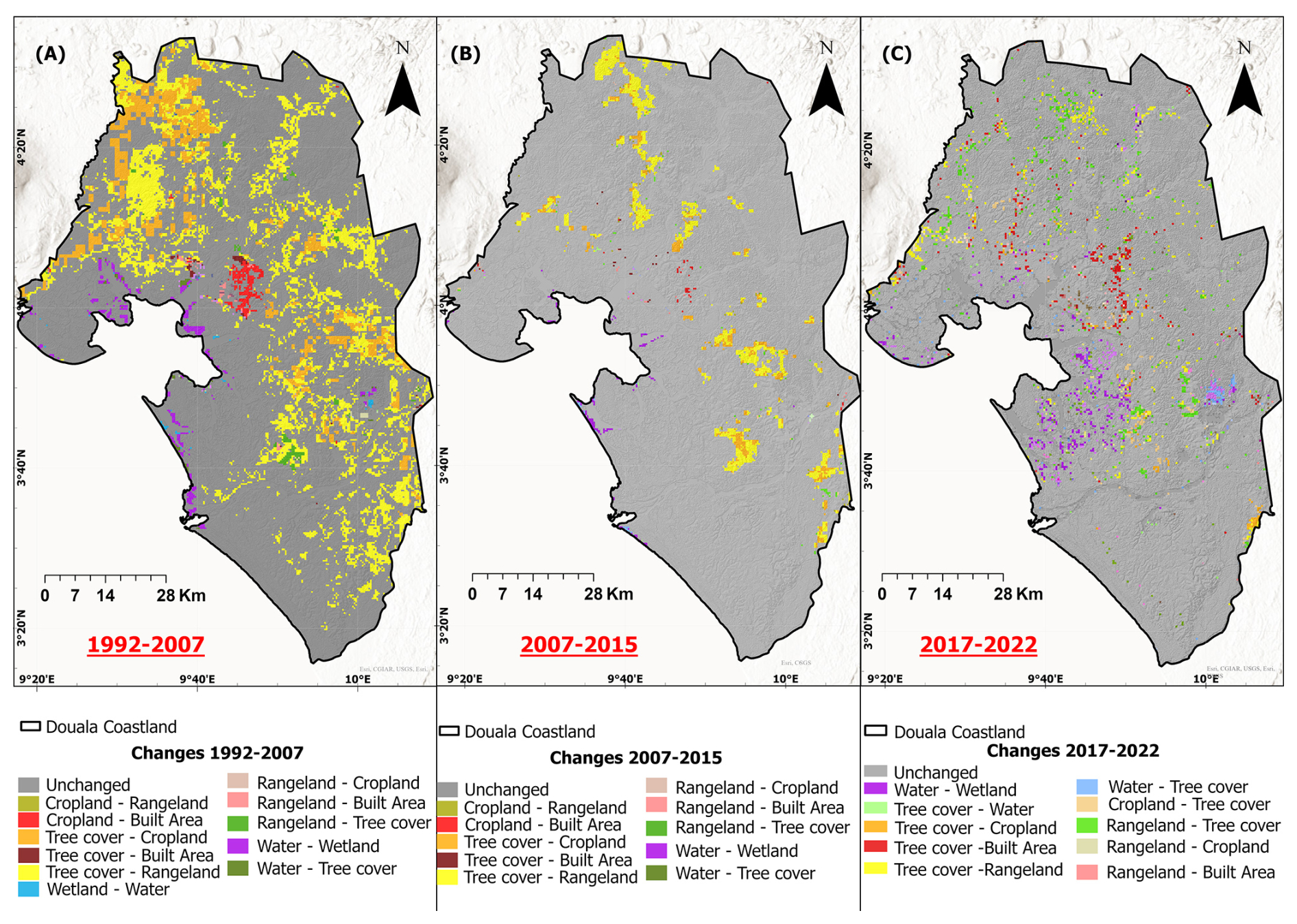 Figure 8Land use and land cover (LULC) changes in Douala coastland over the following time periods: (A) 1992–2007, (B) 2007–2015, and (C) 2017–2022.