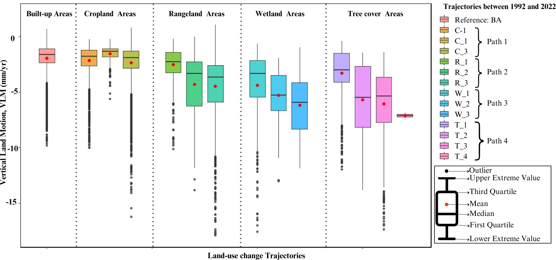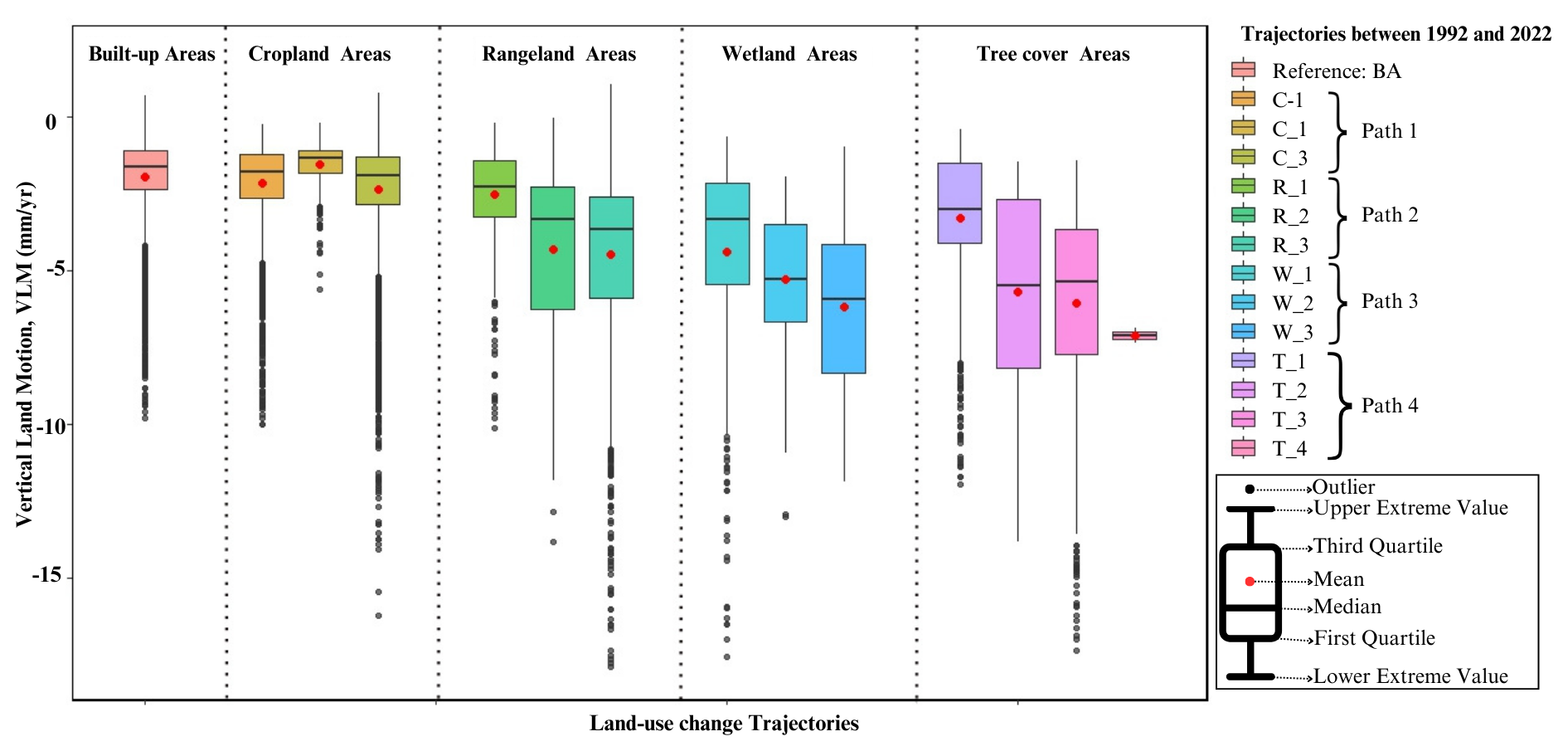 Anthropogenic activities related to land-use practices, such as agricultural activities, groundwater extraction for irrigation, industries, and heavy infrastructure, directly influence subsidence (Galloway and Burbey, 2011; Gambolati and Teatini, 2021). We conducted a statistical analysis of the land-use change trajectories and subsidence rates within specific LULC classes to assess the correlation between the two processes. The results indicate that the mean and median land subsidence rates in each category, except cropland, increased with recent changes in the class to built-up areas. Relatively low subsidence was observed in the trajectories where the change to built-up areas occurred earlier. Indeed, areas that remained built-up from the beginning (1992) to the end (2022) of the investigated period exhibited the lowest average subsidence rate (1.9 mm yr−1), while areas that remained tree cover from 1992 to 2017, and subsequently changed to built-up areas over the last five years demonstrated the highest average subsidence rate (7.1 mm yr−1). This observation also applies to wetland and rangeland categories (Table 6 and Fig. 10). This trend can be attributed to the fact that recently urbanised areas are still undergoing consolidation due to the recent loading increase exerted by structures on the land surface. Moreover, tree root degradation during land-use change potentially contribute to land subsidence (Huning et al., 2024). Croplands, built-up areas, wetlands, and rangelands have notable implications for soil consolidation, which is a critical factor that affects the stability and sustainability of an area. Therefore, an appropriate land-use management mechanism must be considered as an adaptive or mitigating measure for controlling land subsidence.