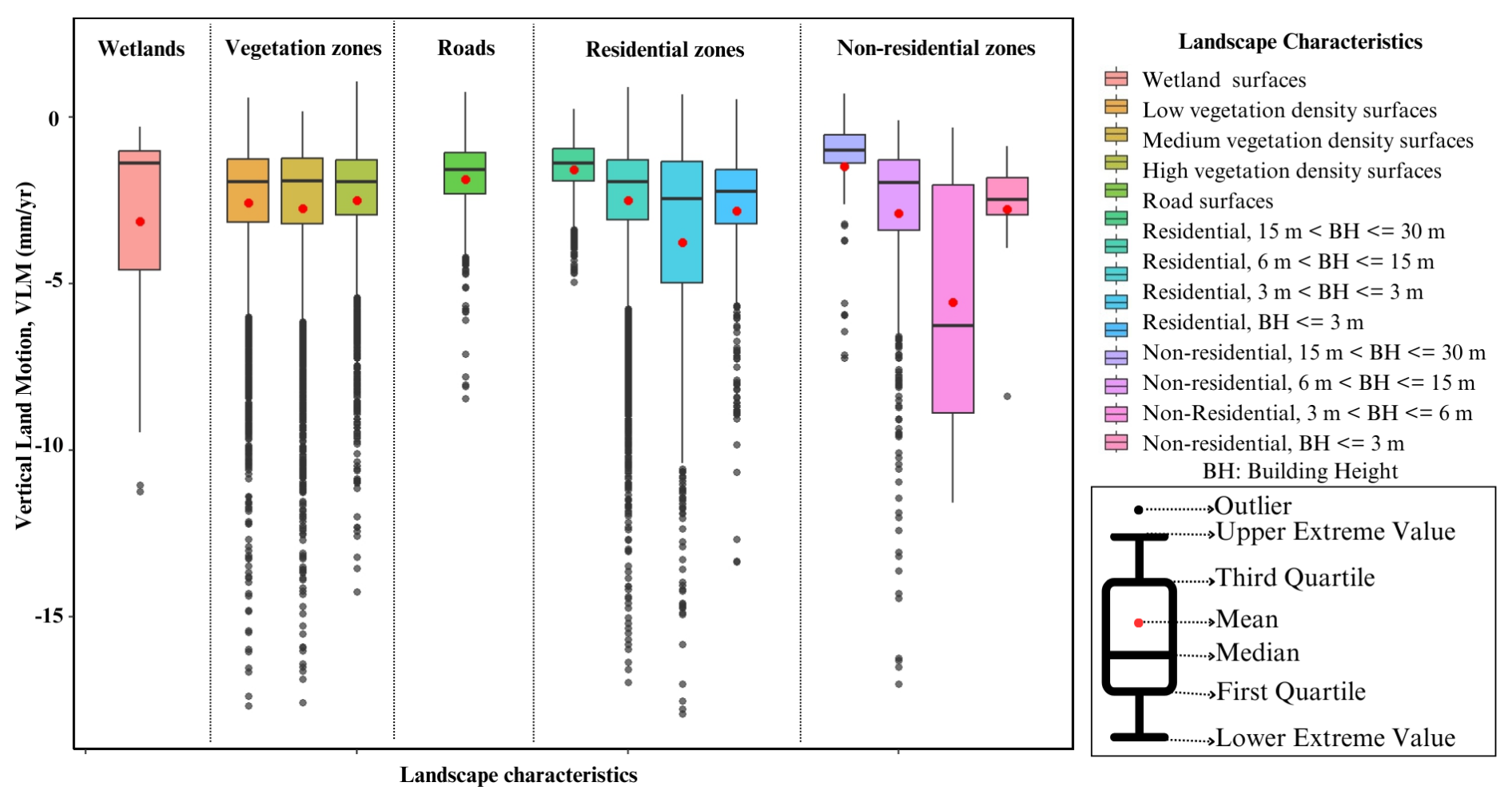 With reference to the urban city of Douala, we investigated the influence of various urban morphological (landscape) characteristics, including wetlands, vegetation zones, roads, and residential and non-residential zones on land subsidence rates. The results revealed significant variations in land subsidence between the residential and non-residential zones. In residential zones, the highest subsidence rate was observed when building heights ranged between 3 and 6 m, whereas taller buildings exhibited relatively lower land subsidence. A similar trend was observed in the non-residential zones (Fig. 11). Taller buildings experienced less subsidence, potentially because of their deep foundations, which made them more stable and unaffected by shallow soil compaction, such as auto-compaction and lowering of the groundwater level in the phreatic aquifer system (Minderhoud et al., 2025). De Wit et al. (2021) reported similar observations in the Mekong Delta, as did Koster et al., (2018), Verberne et al., (2023), and Maoret et al., (2024) in cities in The Netherlands. Nevertheless, we acknowledge that the ability to distinguish deformation patterns between tall and low-rise buildings could be improved using a Persistent Scatterer InSAR (PS-InSAR) processing chain. The InSAR dataset employed in this study provides first-order insights into spatial deformation trends. However, the processing approach used introduces spatial smoothing, which may obscure localized variations in displacement, particularly in densely built-up areas. Future studies applying PS-InSAR methods with higher temporal and spatial sampling could therefore better resolve these fine-scale deformation differences and strengthen the interpretation of structural–geotechnical interactions across the urban landscape. In this context, this study provides a foundation for future detailed investigations of the vulnerability of the Douala coastland to the compound effects of environmental hazards associated with differential land subsidence and consequent relative sea-level rise.