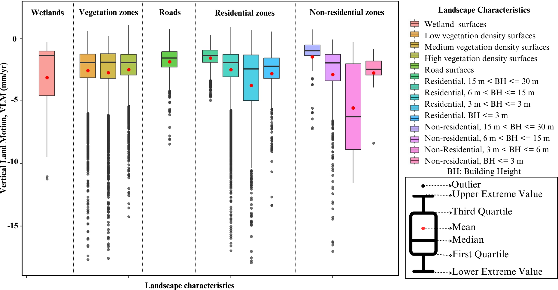 Further analysis was carried out to investigate the possible correlation between land subsidence and landscape within the urban city of Douala. The following landscape characteristics were considered: vegetation density, wetland surfaces, road surfaces, building functional use, and building height (Fig. 11). It appears that the mean subsidence rate in vegetated areas is relatively low at approximately 2.5 mm yr−1, irrespective of low-, medium-, and high-vegetation surfaces. The highest subsidence rate was observed in non-residential (industrial) zones, with buildings heights ranging from 3 to 6 m. This range corresponds to the mean and medium ranges of building height. In contrast, comparatively tall buildings in both residential and non-residential zones show very low subsidence, and the subsidence rate decreased with increasing building height.