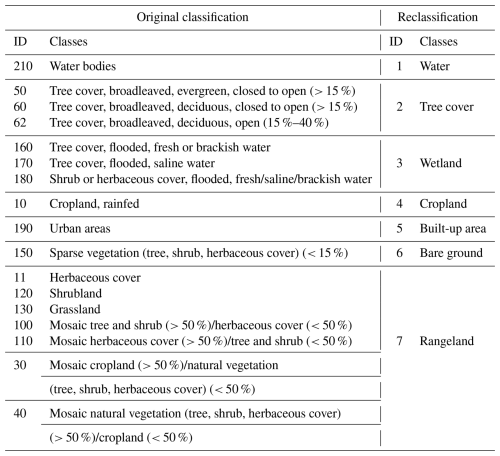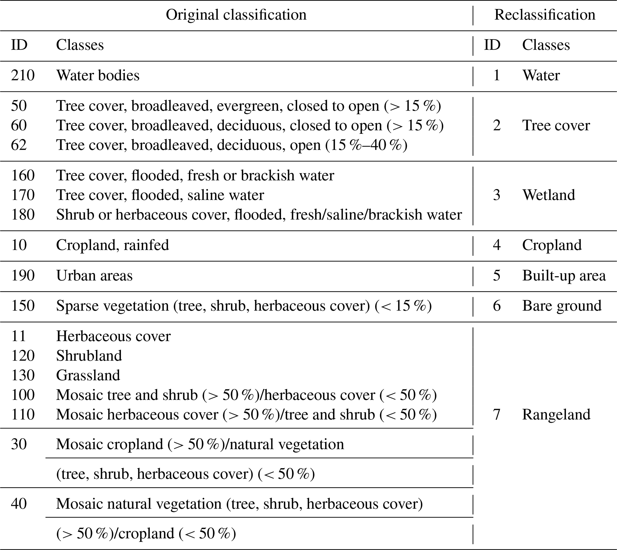 Table 1Land-use and land-cover reclassification table for the European Space Agency (ESA) dataset (land-cover data 1992–2015).