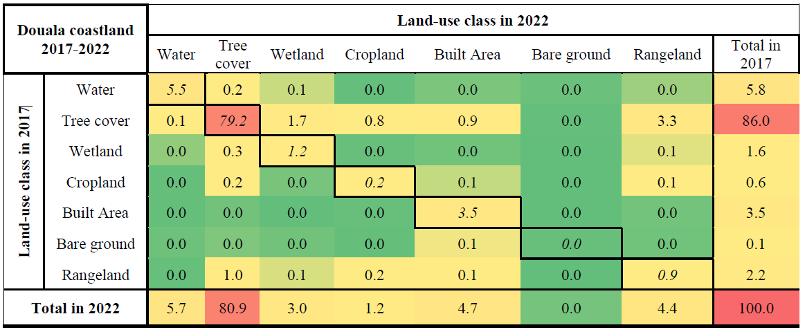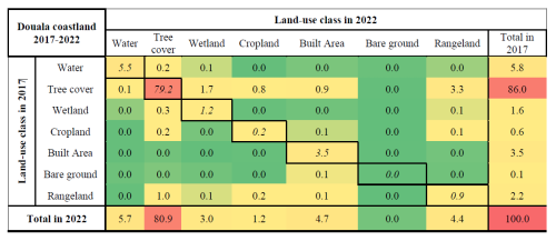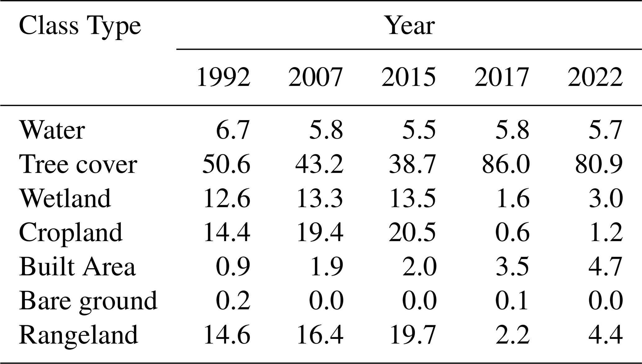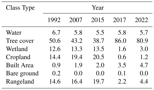 Table 2Distribution (in %) of Land use and land cover (LULC) classes for the years 1992, 2007, 2015, 2017, and 2022 in the Douala coastland. The percentage of classes cannot be summed to 100 because cloud-covered areas were excluded.