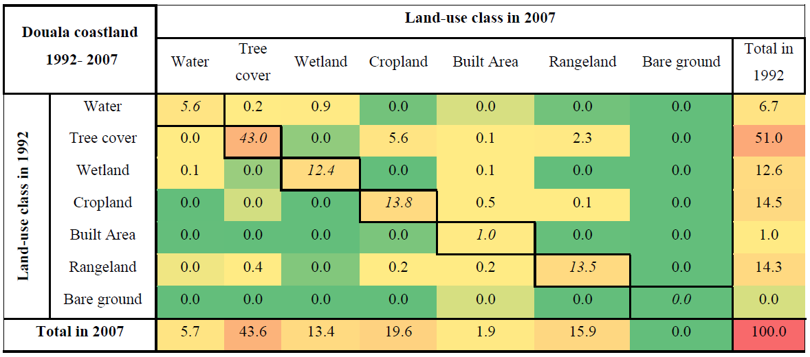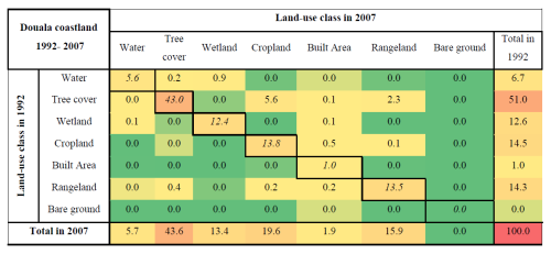 Table 3Land use and land cover (LULC) changes from 1992 to 2007 expressed as a percentage of the total study area, excluding cloud-covered regions. A color-coded scale from green to red is used to highlight null to large values, respectively. LULC remained unchanged in 89 % of the study area, see the values in italics located along the diagonal.