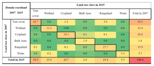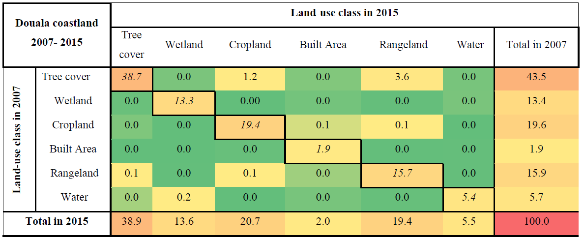 Table 4Land use and land cover (LULC) changes from 2007 to 2015 expressed as a percentage of the total study area, excluding cloud-covered regions. A color-coded scale from green to red is used to highlight null to large values, respectively. LULC remained unchanged in 94 % of the study area, see the values in italics located along the diagonal.