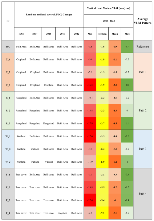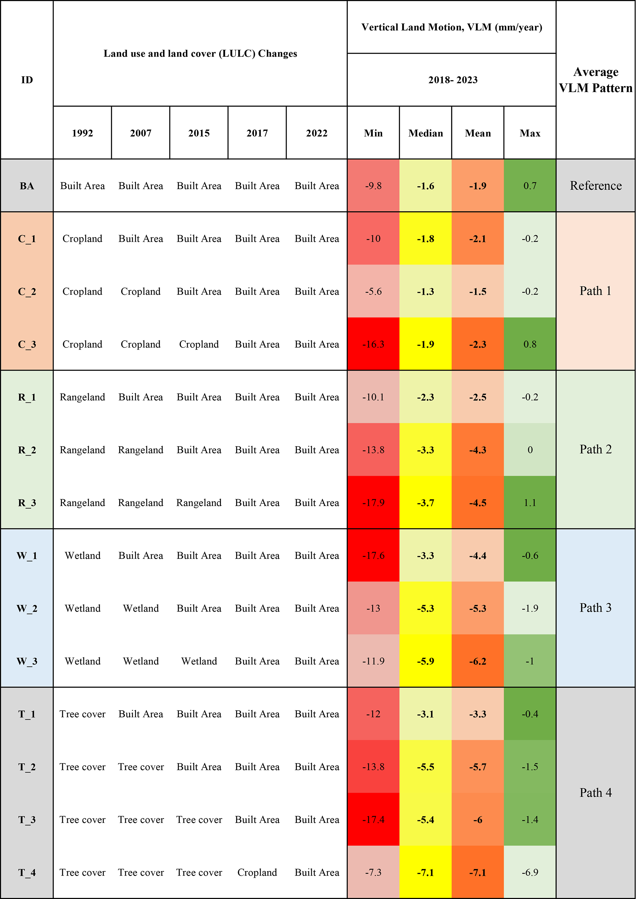 Table 6Statistical description of VLM with respect to various categories of LULC changes and urbanisation between 1992 and 2022. A color-coded intensity was used, independently in each column and within each path, to highlight land subsidence (negative VLM) amount. Darker colours indicate more severe land subsidence.