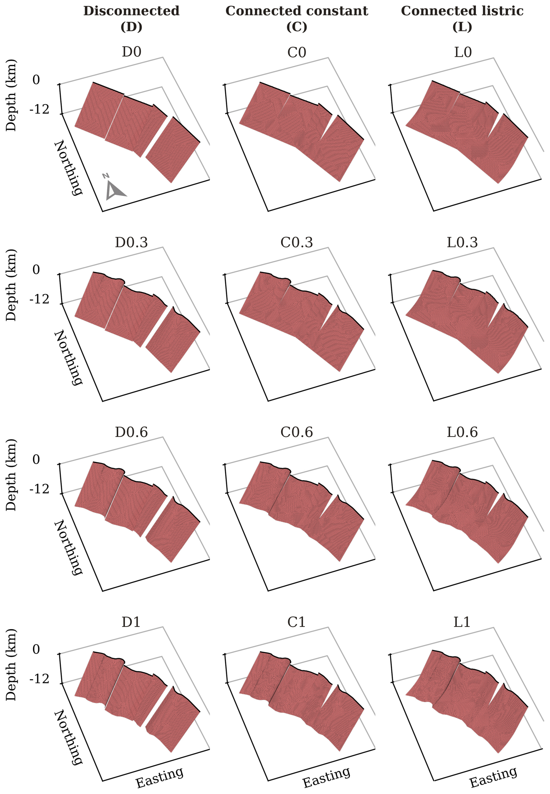 Figure 2Geometric fault models explored in this study. Columns group models with the same fault connectivity and dip at depth, while rows group models with the same fault sinuosity defined by the fault surface and bottom trace.