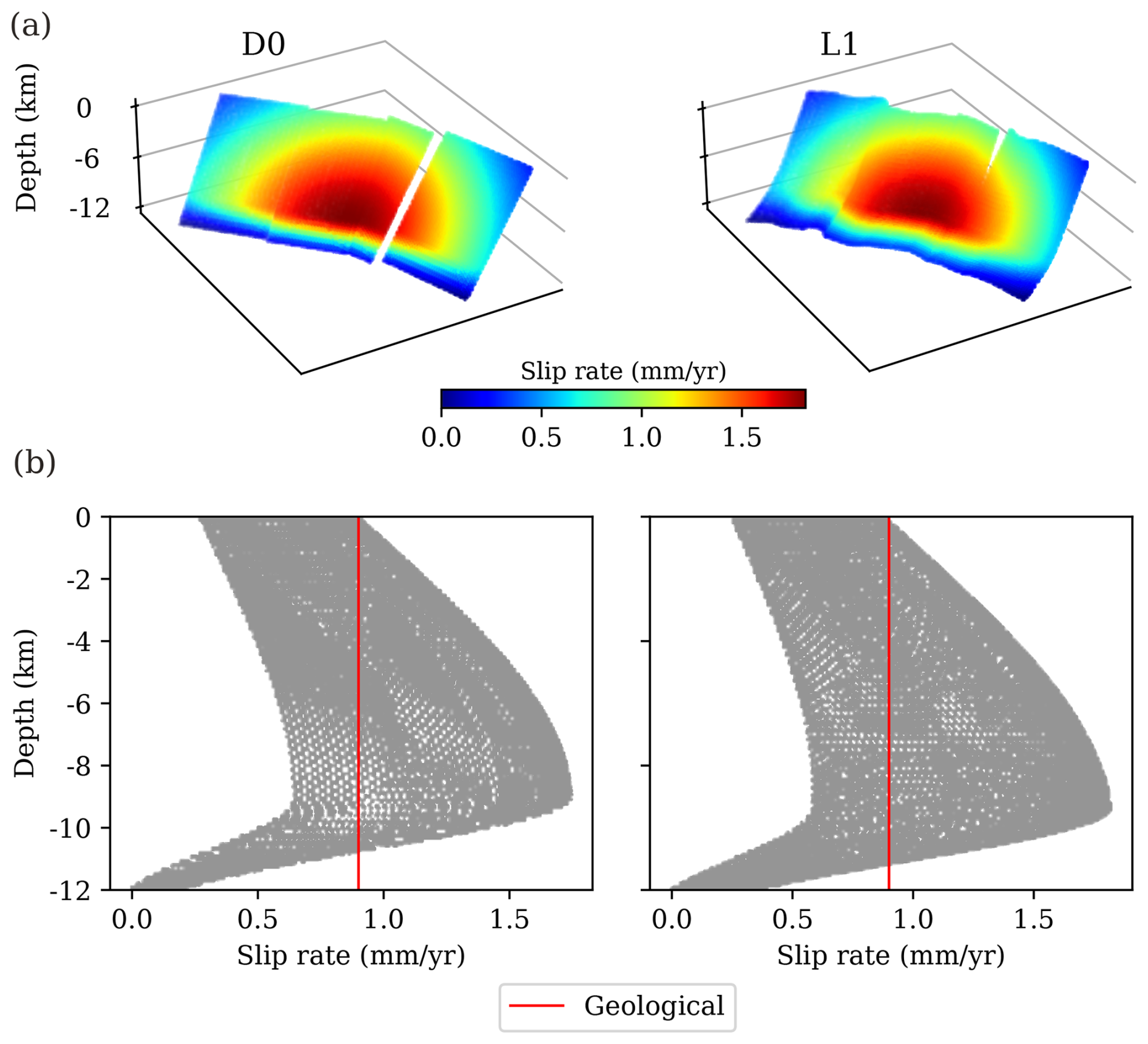 We ensure that surface slip rate in the central part of the trace is consistent with the geological slip rates derived from surface studies in the central part of the fault – around 0.9 mm yr−1, which is the upper bound of the minimum slip rate (Pousse-Beltran et al., 2022) (Fig. 3b).