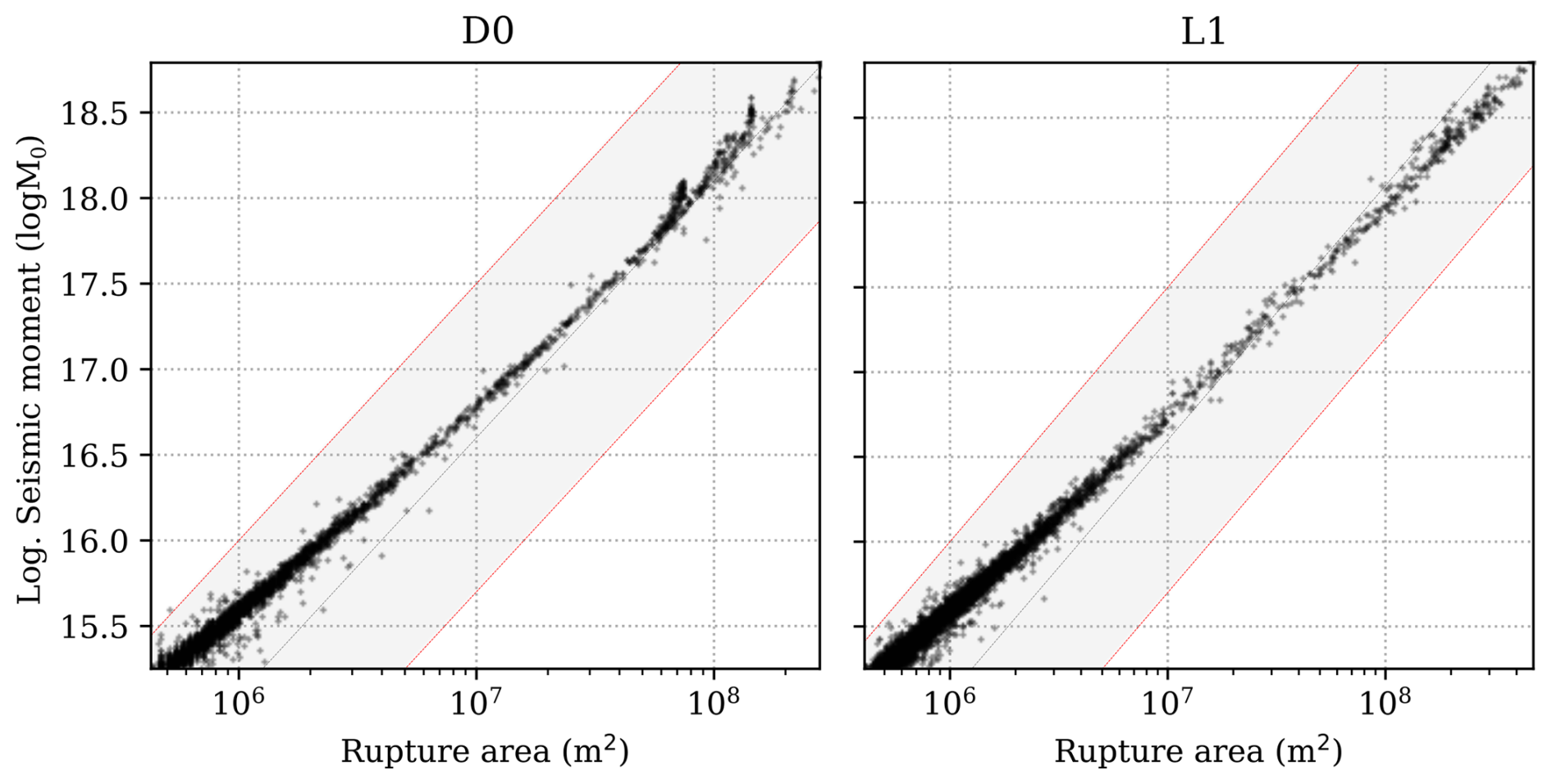 As a first step and to ensure optimal performance of the simulated earthquake catalogues for the different fault models explored, we analyze how well the simulated catalogues match the predicted values of the rupture area-seismic moment scaling relationship by Leonard (2010) for normal faults. Figure 5 shows the analysis for the two geometric end members analyzed for the model parametrization: D0 and L1. The analysis for the complete set of geometric models can be found in Fig. S3.