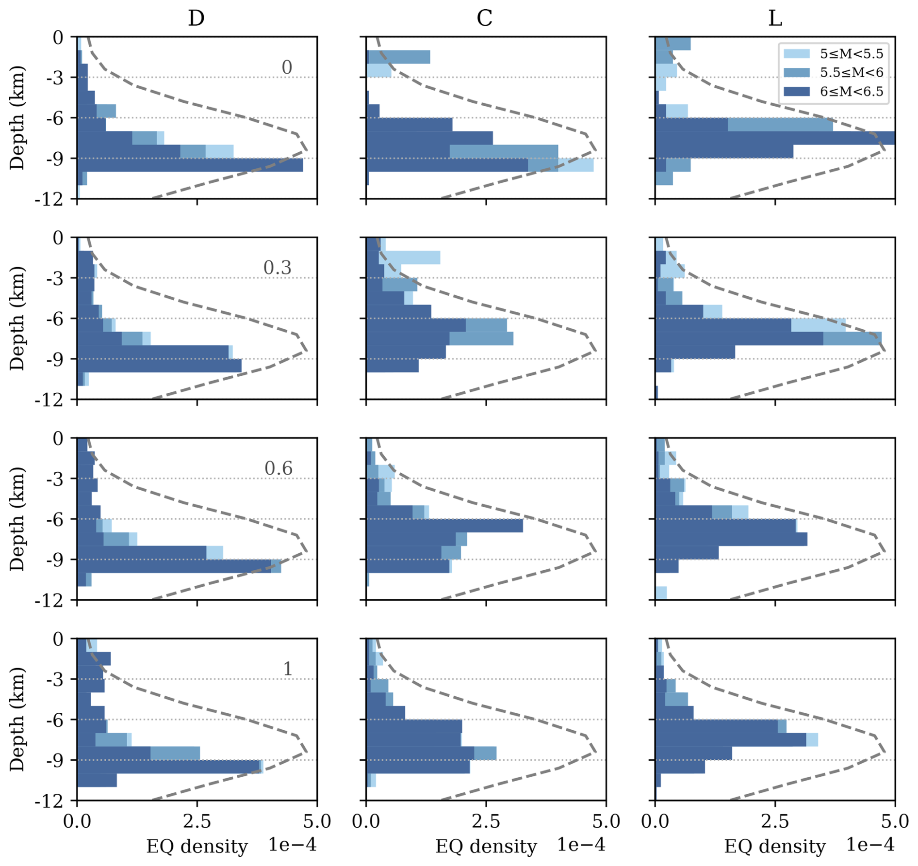 Figure 6Magnitude-dependent hypocenter depth distributions of the different geometric models explored in this study. The dashed curve corresponds to the empirical hypocentral depth distribution for extensional faults in Italy from Mammarella et al. (2024).