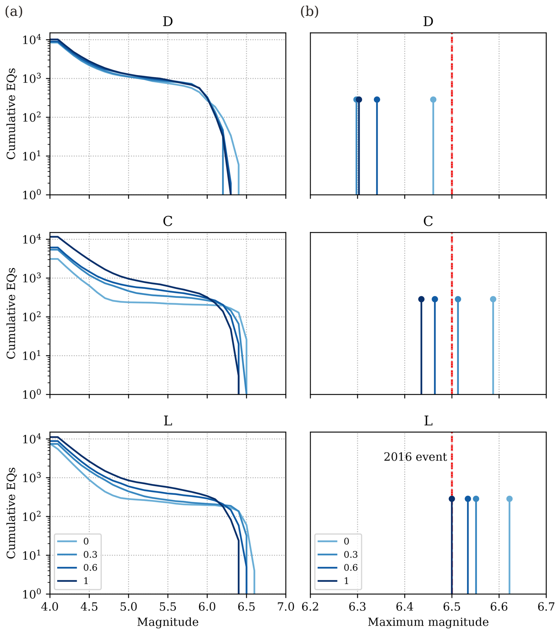 Figure 7(a) Magnitude-frequency distributions (MFD) and (b) maximum magnitudes of each one of the models grouped by their depth connectivity level and dip. Dashed red line in panel (b) corresponds to the magnitude of the largest event of the Mw 6.5 2016 Central Italy sequence.