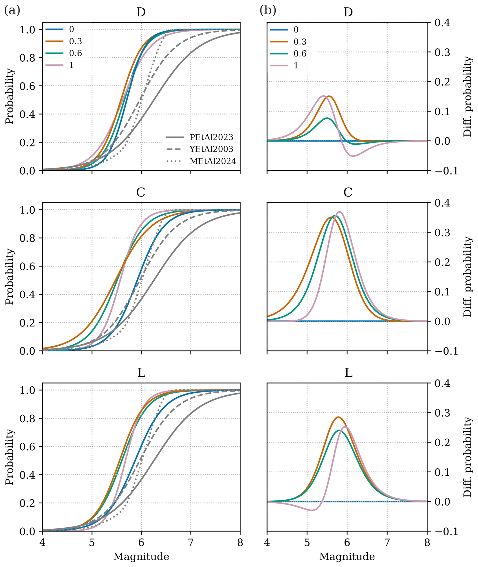 We compare the regressions of surface rupture probability with the empirical curves for normal faults in the Great Basin by Youngs et al. (2003) and worldwide normal faults by Pizza et al. (2023), and the numerical curves for normal faults by Mammarella et al. (2024), considering the Thingbaijam et al. (2017) scaling equations and site-specific inputs for our study area: a seismogenic depth of 12±1km, a dip angle of 60 ± 5° and the hypocentral depth ratio of Italian normal faults (i.e., peak of hypocentral depths at around 67 % of the seismogenic depth). See Mammarella et al. (2024) for details on input parameters.