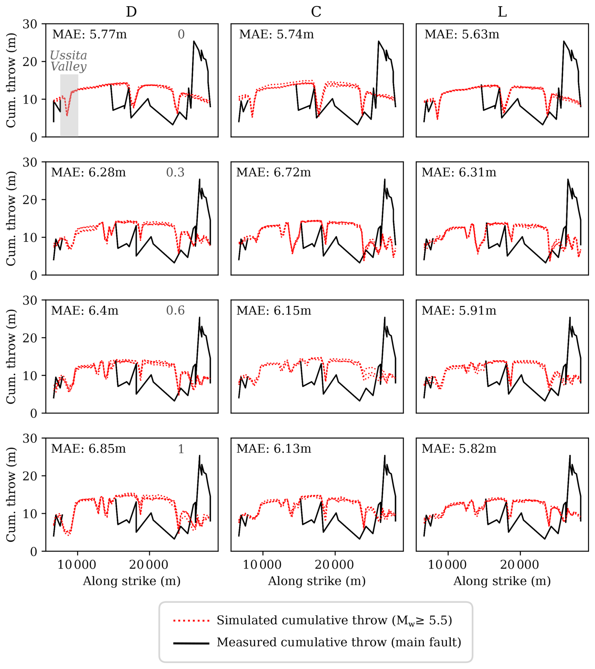 Second, even though we have omitted long-term geomorphic processes and structural complexities at depth, the cumulative throw is partially captured by our models and its spatial trends are preserved with respect to observations (e.g., segment limits).