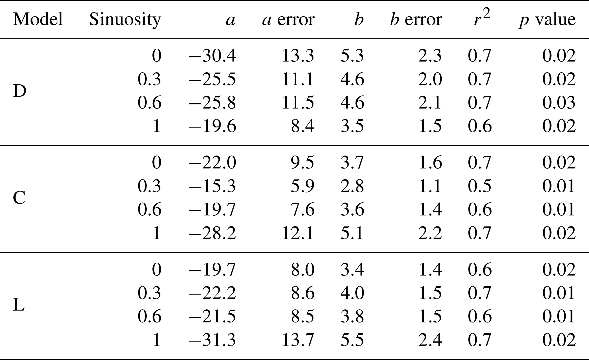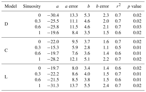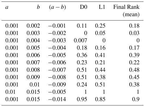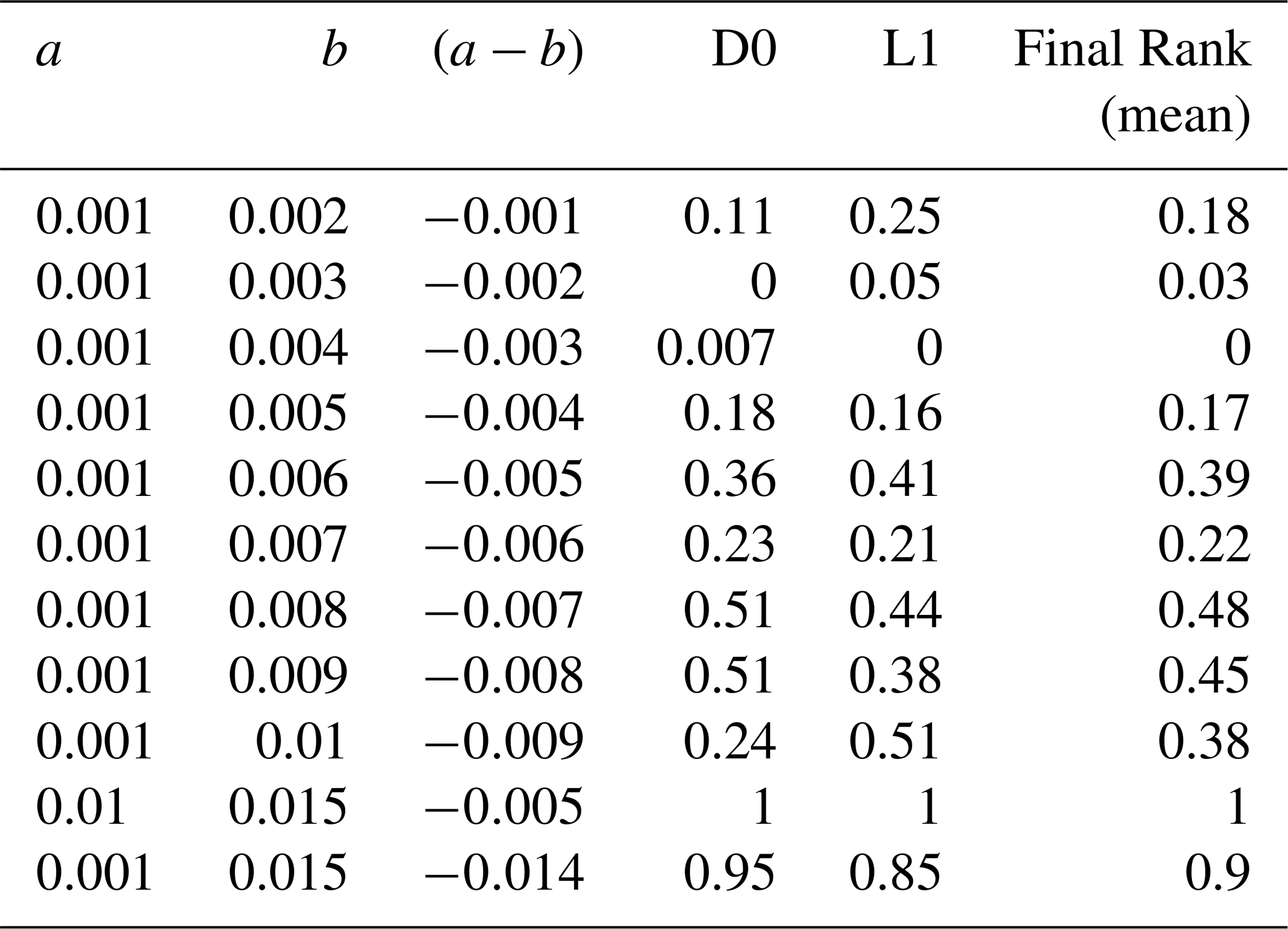 To find the most suitable set of (ab) parameters, we run benchmarking tests for the two geometric end members (D0 and L1) using an exploration parameter tree, resulting in 11 models for each geometric configuration (Table 1). From these benchmark tests we obtain quality ranks for both geometric ends as a function of (ab). To find the overall best model, we average both model ranks for each (ab) combination and select the better performing one. In Table 1 we show the resulting ranks of each (ab) combination in a 0–1 scale (0 being the best and 1 the worst). The selected a and b values are 0.001 and 0.004, respectively.