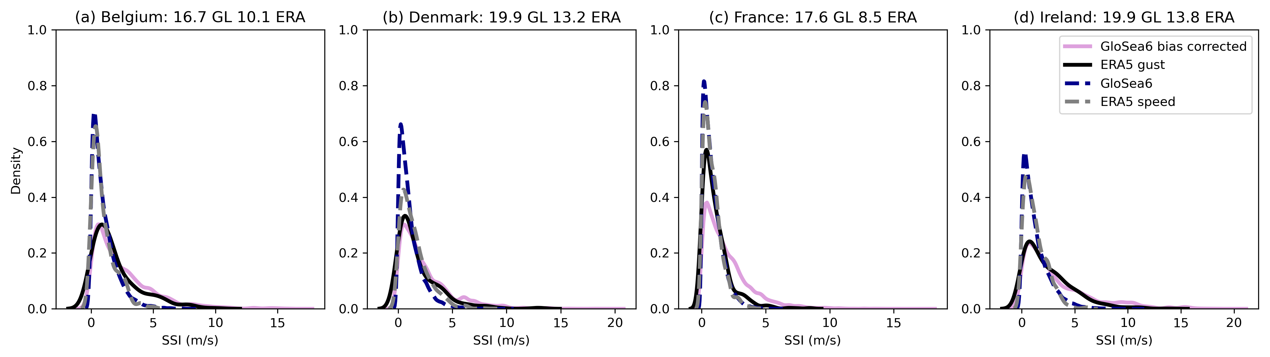 Figure 3Distributions of the storm severity index (SSI) calculated in GloSea6 and ERA5. Wind speed SSIs are shown for ERA5 and GloSea6, together with adjusted wind speed SSIs from GloSea6 (i.e. GloSea6 wind gust SSIs) and wind gust SSIs from ERA5. The SSI distributions are shown for Belgium (a), Denmark (b), France (c) and Ireland (d) as a representative sample of the countries included in this article. Maximum values of the wind gust SSIs are shown in the panel titles for Glosea6 (GL) and ERA5 (ERA).