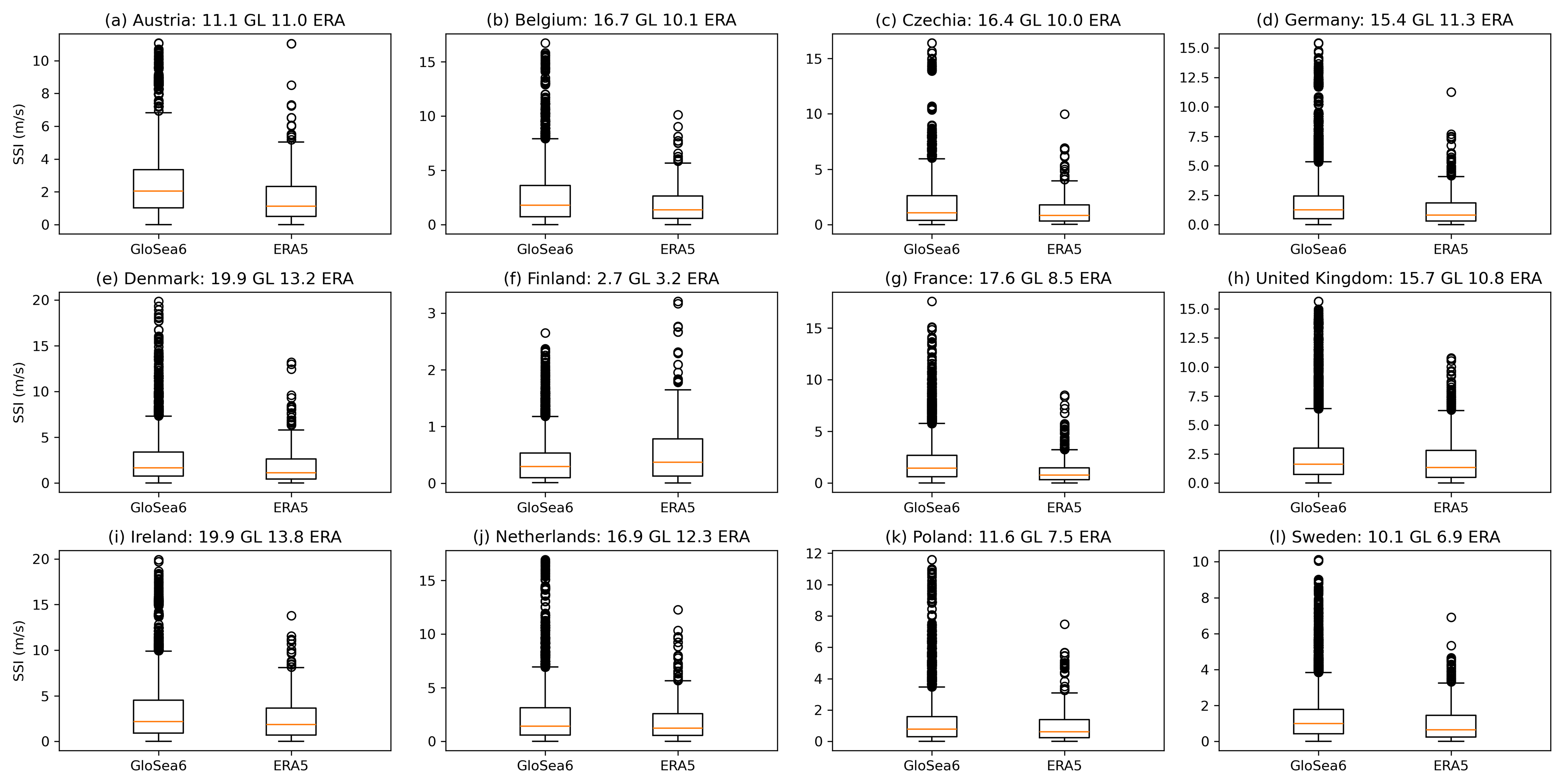 Figure 4Distributions of the wind gust SSI for each country included in the analysis for GloSea6 and ERA5. The values shown in the panel titles are the maximum SSI value in GloSea6 (GL) and ERA5 (ERA).