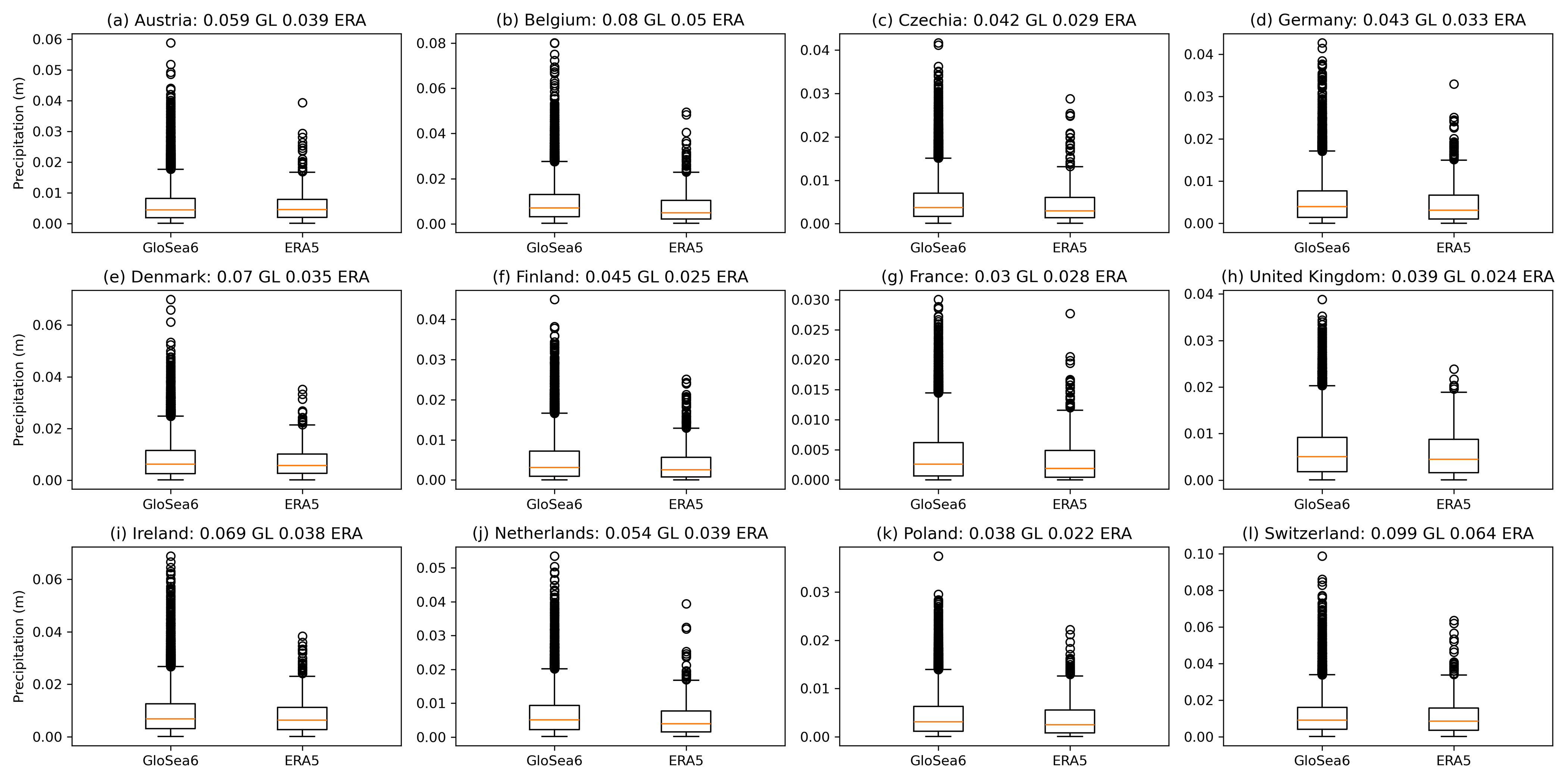 The likelihood of unprecedented precipitation impacts are now quantified. Distributions of the precipitation-impact metric (country-aggregated ETC-associated precipitation) are presented in Fig. 5 for each country. As for the wind-impact metric (Fig. 4), the medians (orange lines in Fig. 5) agree well in GloSea6 and ERA5, showing that there are no major biases in ETC-related precipitation in the seasonal forecast model. It is also evident that GloSea6 contains several events in which the expected precipitation impact is more extreme than any observed in the ERA5 historical period. The maximum precipitation impact from an ETC found in the GloSea6 dataset is around 1.5 times larger than the maximum in ERA5. An increase in precipitation from a cyclone of that order would pose a significant flood risk.