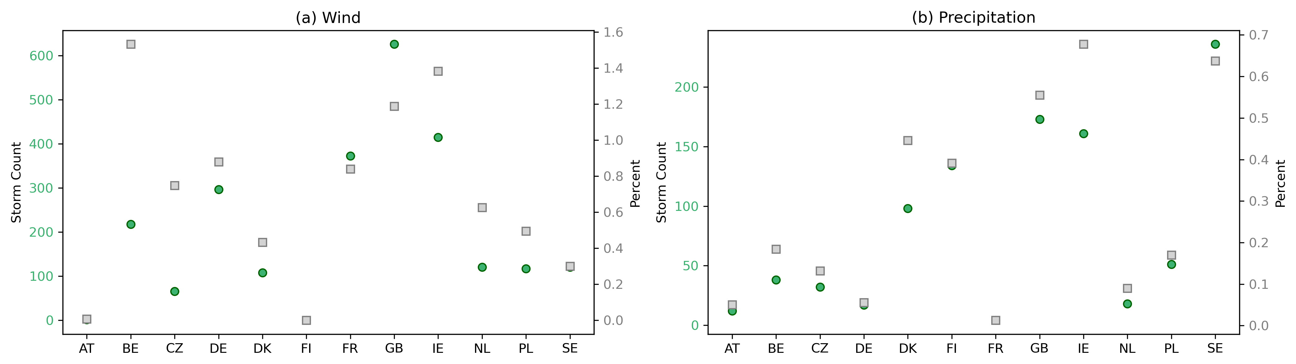 Figure 6(a) The number of ETCs with unprecedented wind impacts in the GloSea6 dataset for each country (green circles, left y axis). The percent of all of the storms impacting a country that are unprecedented is also shown (grey squares, right y axis). (b) Same as in panel (a) but for ETCs with unprecedented precipitation impacts.