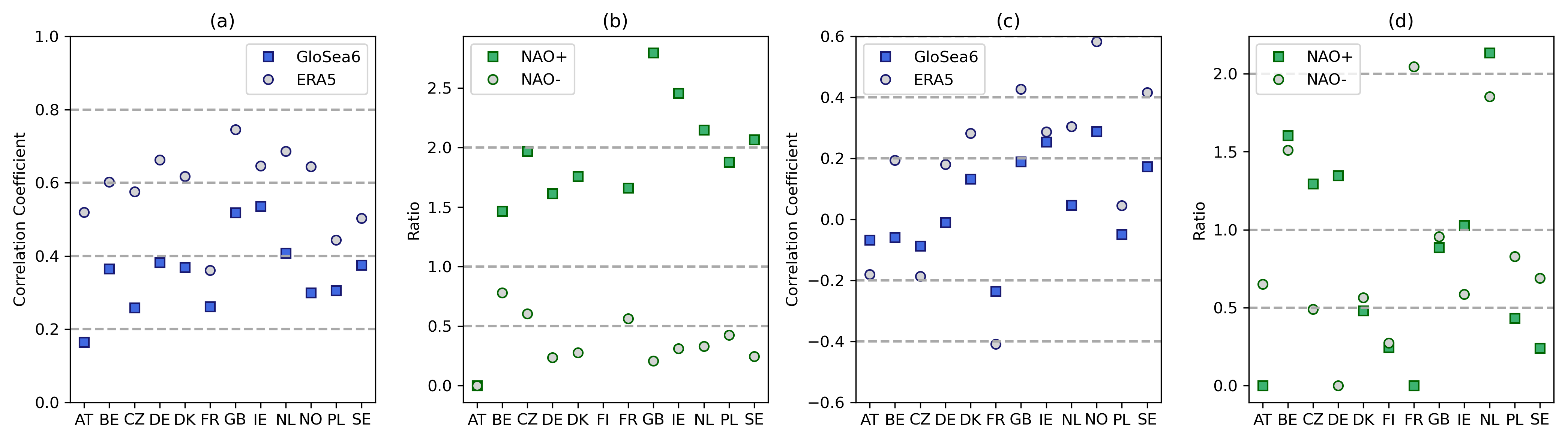 Figure 7(a) Correlations between the annual exceedance probability (AEP) and the seasonal mean NAO values for each country considered in the GloSea6 and ERA5 datasets. (b) The change in likelihood in GloSea6 of occurrence of unprecedented ETC wind impact given a strongly positive (NAO+) or strongly negative (NAO−) NAO index, defined as above the 90th percentile of NAO values or below the 10th, respectively. Dashed lines in panel (b) represent no changes in likelihood (1.0), a doubling in likelihood (2.0) and halving in likelihood (0.5). (c) As in panel (a) but correlating the seasonal mean NAO with seasonal totals of ETC-precipitation. (d) As in panel (b) but for the ETC precipitation impact metric.