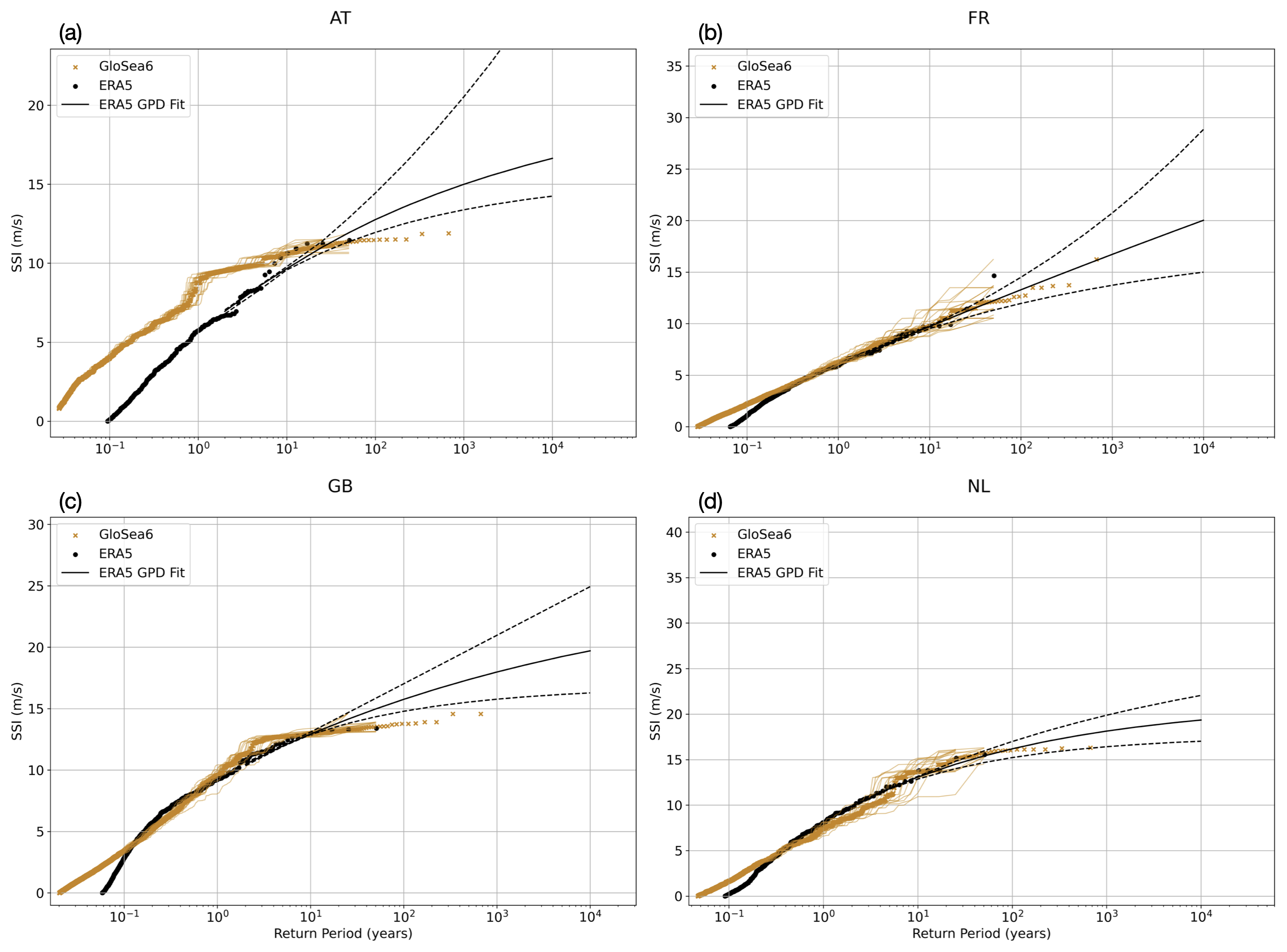 Figure 8SSI curve against return period (note the x axis is on a log scale), for the GloSea6 event set (orange) and ERA5 event set (black) for (a) Austria, (b) France, (c) Great Britain and (d) the Netherlands. SSI values for ERA5 are here calculated using the hourly 10 m wind gust since previous post-processing at 0.25 × 0.25° resolution as follows. Event dates in the ERA5 event catalogue are extracted for storms between 1972 and 2022 and the SSI is calculated based on the 3 s peak gust using a 20 m s−1 threshold using Eq. (1). A Generalized Pareto Distribution (GPD) is fitted to the reference catalogue following the Peaks Over Threshold (POT) method. The median fit (black solid lines) and its corresponding uncertainty (black dashed lines) are shown. The uncertainty of the GPD fit results from the selection of the threshold and parameters of the fit. This is reported to 95 % confidence intervals. The thresholds for the POT method are selected based on the 85th–95th percentiles of SSI values. For GloSea6, SSI values for the full event set are shown in orange crosses, while the orange lines show 20 samples of these, each of 50 randomly selected seasons. An additional bias correction is included here whereby the GloSea6 curve is shifted vertically so that the SSI value at a return period of 10 years is equal to that in ERA5.