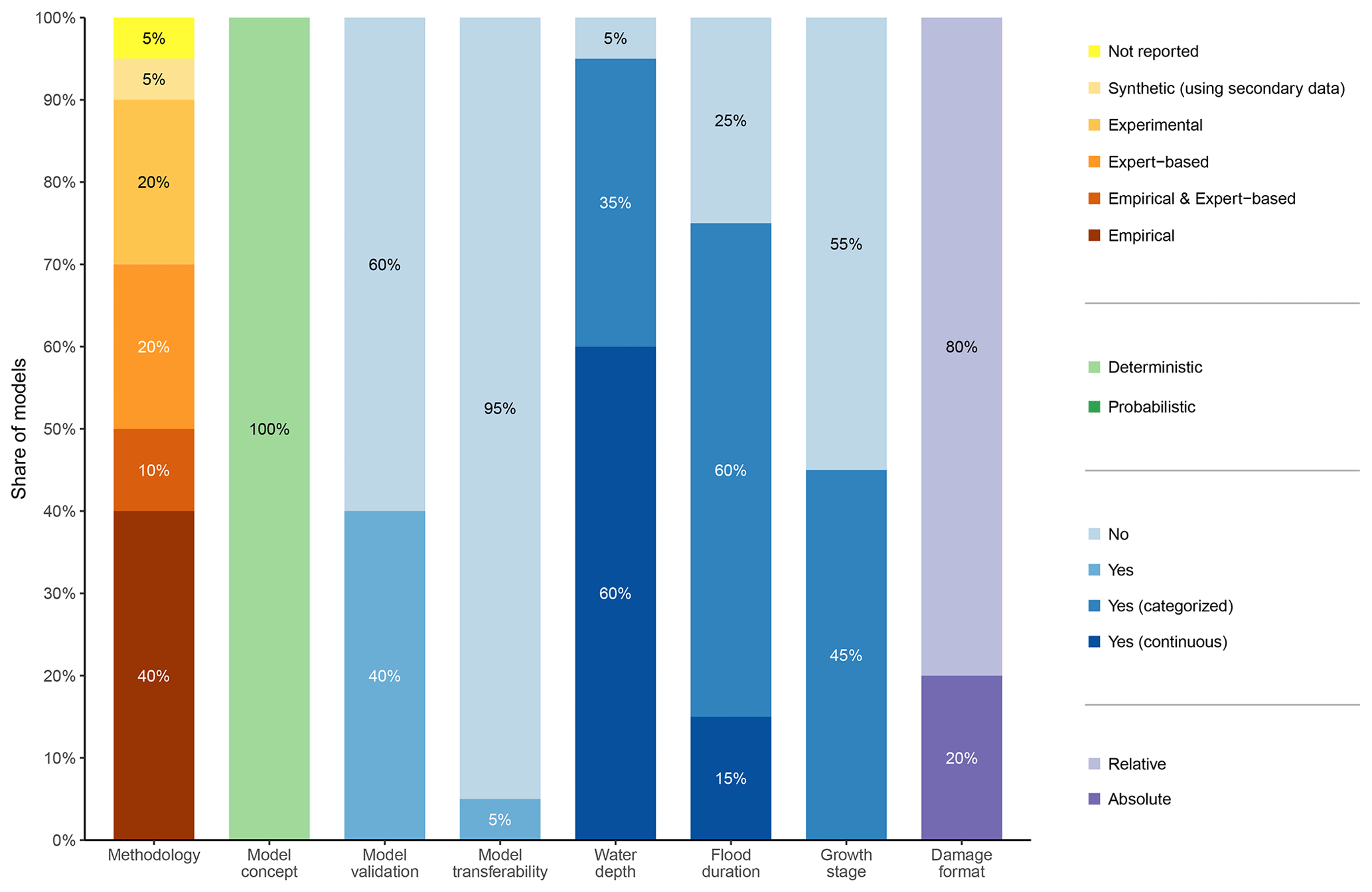 Figure 1Characteristics of flood damage models for rice in the inventory. The figure shows model characteristics, including the methodology to build the model, the model concept (deterministic or probabilistic), and whether model validation and model transferability assessment were reported in the publication. The four columns on the right indicate the inclusion and format of three commonly used predictors (water depth, duration, and growth stage) and the damage format. When a publication presented multiple model variations with the same variables for one country, the model was counted once.