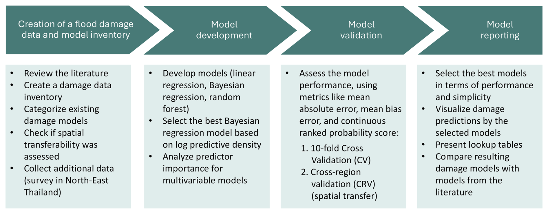 The objective of this study is to conceptualize and implement a four-step methodological framework for advancing flood damage models for rice, which is also applicable to other crops. The framework supports flood damage modeling for crops that integrates machine learning approaches in the model development and validates models across regions. The methodology aims to advance flood damage models for rice crop losses. In this context, there is a lack of models that quantify prediction uncertainties and evaluate the possibility of transferability across regions. Empirical data (reported from farm owners) provide real-world observations of hazard, exposure, and damage for calibrating and validating flood damage models. Machine-Learning models use empirical data to learn complex, multi-level relationships between flood characteristics and resulting losses, often outperforming traditional stage-damage functions. Combining empirical data with machine learning-based probabilistic models has enabled transferable and reliable flood damage predictions (Rözer et al., 2019; Sairam et al., 2020).
