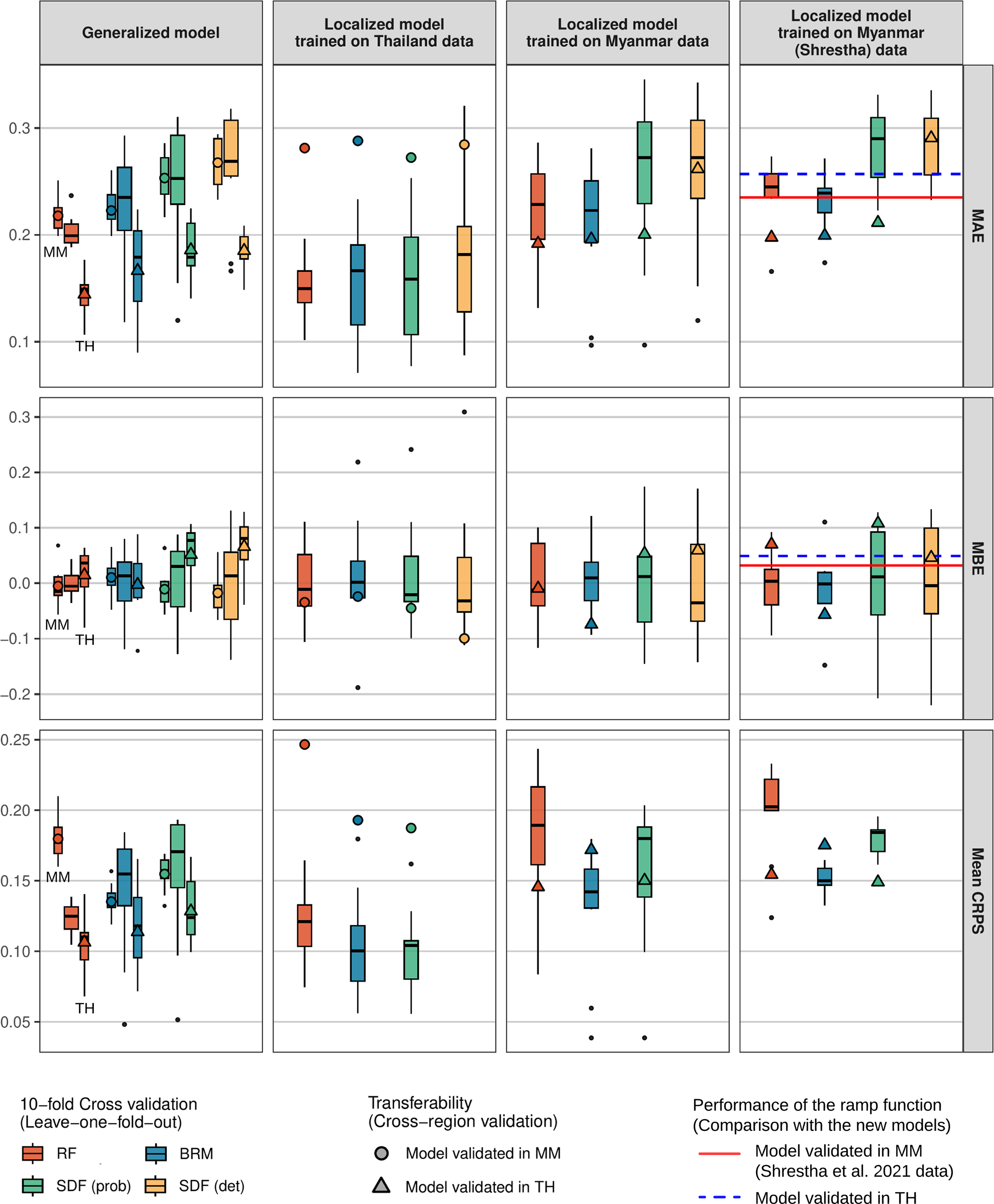 Figure 5Results of performance evaluation and transferability assessment. Results are shown for three performance metrics (rows) and four calibration setups (generalized, localized trained on Thailand data and Myanmar data, and localized trained on Myanmar data by Shrestha et al., 2021) (columns). Colors indicate the model types (RF, BRM, probabilistic SDF, and deterministic SDF). Boxplots show the 10-fold cross-validation results. The thick lines show the median; boxes represent the interquartile range (IQR); whiskers extend to 1.5 × IQR; and black points are outliers. Each box summarizes variability across 10 folds. For localized models, shapes indicate the performance of transferred models (CRV). For generalized models, shapes indicate mean performance metrics from local validation across ten folds, and the thin boxplots summarize variability in the local validation across the 10 folds. The lines mark the mean performance of the benchmark ramp function in Myanmar (solid red line) and in Thailand (dashed blue lines).