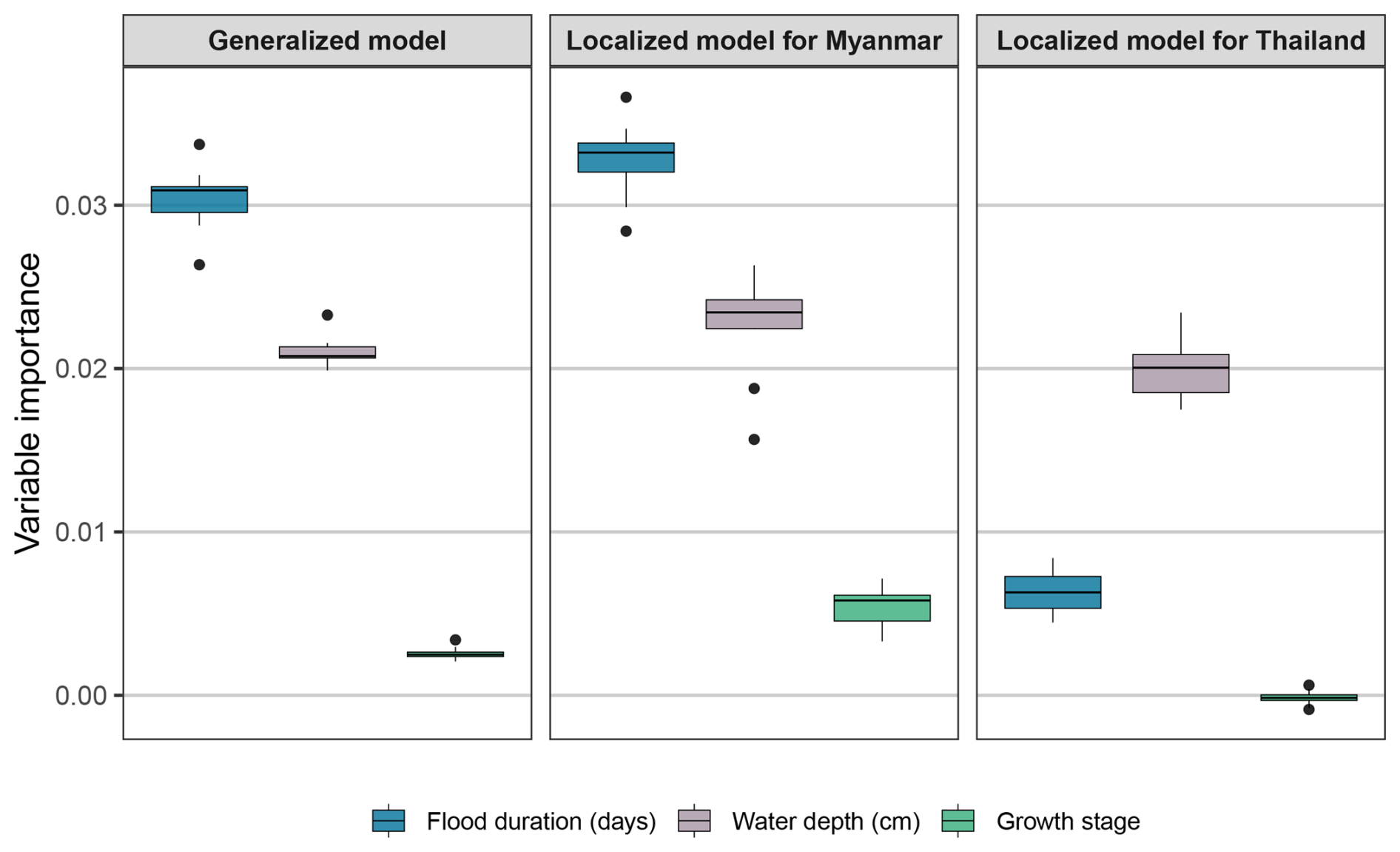 In the generalized RF model and the localized model for Myanmar, flood duration emerged as the most important predictor, followed by water depth. Growth stage contributed the least. In contrast, the localized RF model for Thailand ranked water depth highest, with flood duration playing a secondary role. Growth stage showed almost no importance in the Thailand model.