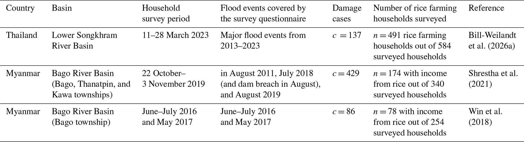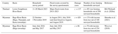 In addition to the secondary datasets, we conducted a household survey among farmers in Northeast Thailand to collect flood damage data concerning rice. The survey data collected in Thailand are comparable to those from Myanmar. We interviewed 584 households (20 % of the 2904 total) in the Lower Songkhram River Basin in March 2023, exceeding the minimum sample size for a 95 % confidence level (see a map in Fig. S1 and Tables S2–S3 for details on the data collection). The methodology of the household survey conducted from 11–28 March 2023, is described in detail in the Supplement (Sect. S1.2). The data used for the model development is publicly available (Bill-Weilandt et al., 2026a).