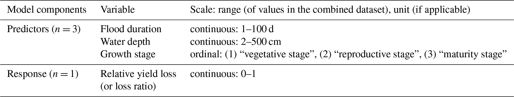 Table 1Flood damage datasets for rice used for the model development, including the variables relative yield loss, water depth, flood duration, and growth stage.