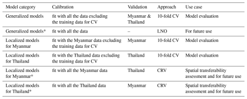 Table 4Overview of performance evaluation approaches. The table presents the model category (either generalized or localized model), the data used to fit the model (calibration), and the data used to assess the performance (validation). It further describes the approach used, including 10-fold CV, Leave-nothing-out (LNO) (creation of models trained with all the data for use in future risk assessments), and cross-region validation (CRV). Finally, the use case of each model type is mentioned. The models highlighted with an asterisk are available on GitHub (see Data Availability Statement).