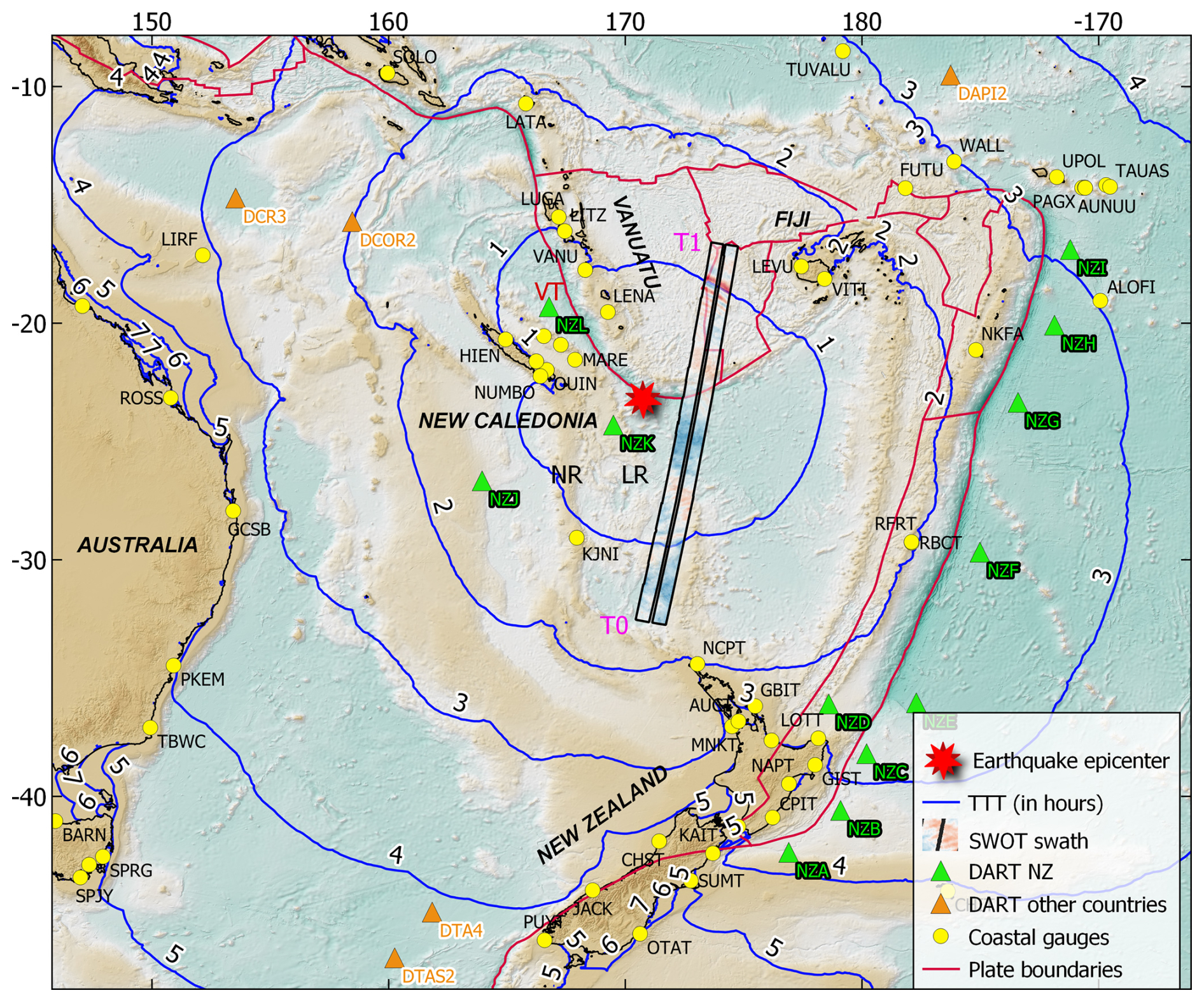 Figure 1The 19 May 2023 Mw 7.7 earthquake and tsunami. Tsunami travel times from the epicenter were calculated using Mirone software (Luis, 2007). The coloured band symbolizes the swath track of the SWOT satellite dataset presented herein with T0 and T1 symbolizing the start and end time of the swath. VT: Vanuatu Trench; LR: Loyalty Ridge; NR: Norfolk Ridge. Background topography is from GEBCO (GEBCO Bathymetric Compilation Group 2023, 2023).