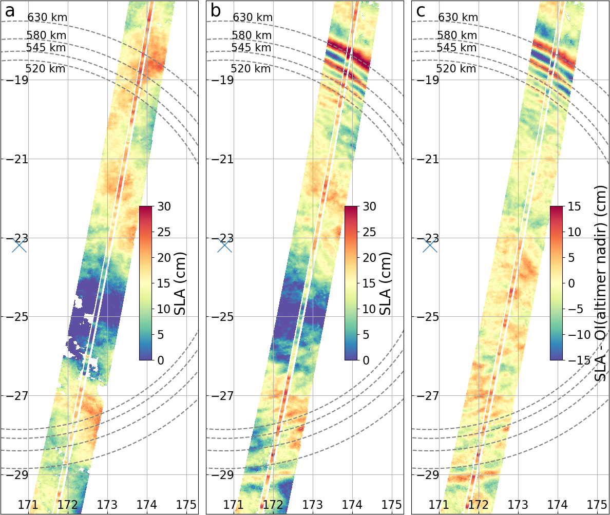 To extract the finest estimation of tsunami signal from altimeter measurements, a specific processing is necessary. First a Sea Level Anomaly (SLA) is obtained after instrumental and geophysical correction (e.g., tide signal, or ocean response to atmospheric pressure and wind). The L3 variable “ssha” containing the SWOT 2D SLA includes many different ocean signals such as large scale and mesoscale ocean variability which have to be removed for our analysis. To this end, the MIOST (Multivariate Inversion of Ocean Surface Topography) mapping technique (Ubelmann et al., 2021, 2022) was used to map these oceanic signals not related to the tsunami, interpolating data in space and time along the 19 May 2023 SWOT profile. These interpolated SLA data correspond to the sea level signals that would have been observed on 18 May, when the tsunami had not occurred yet. This algorithm is applied to the 7 Nadir altimeter satellites in order to produce the best signal estimation.