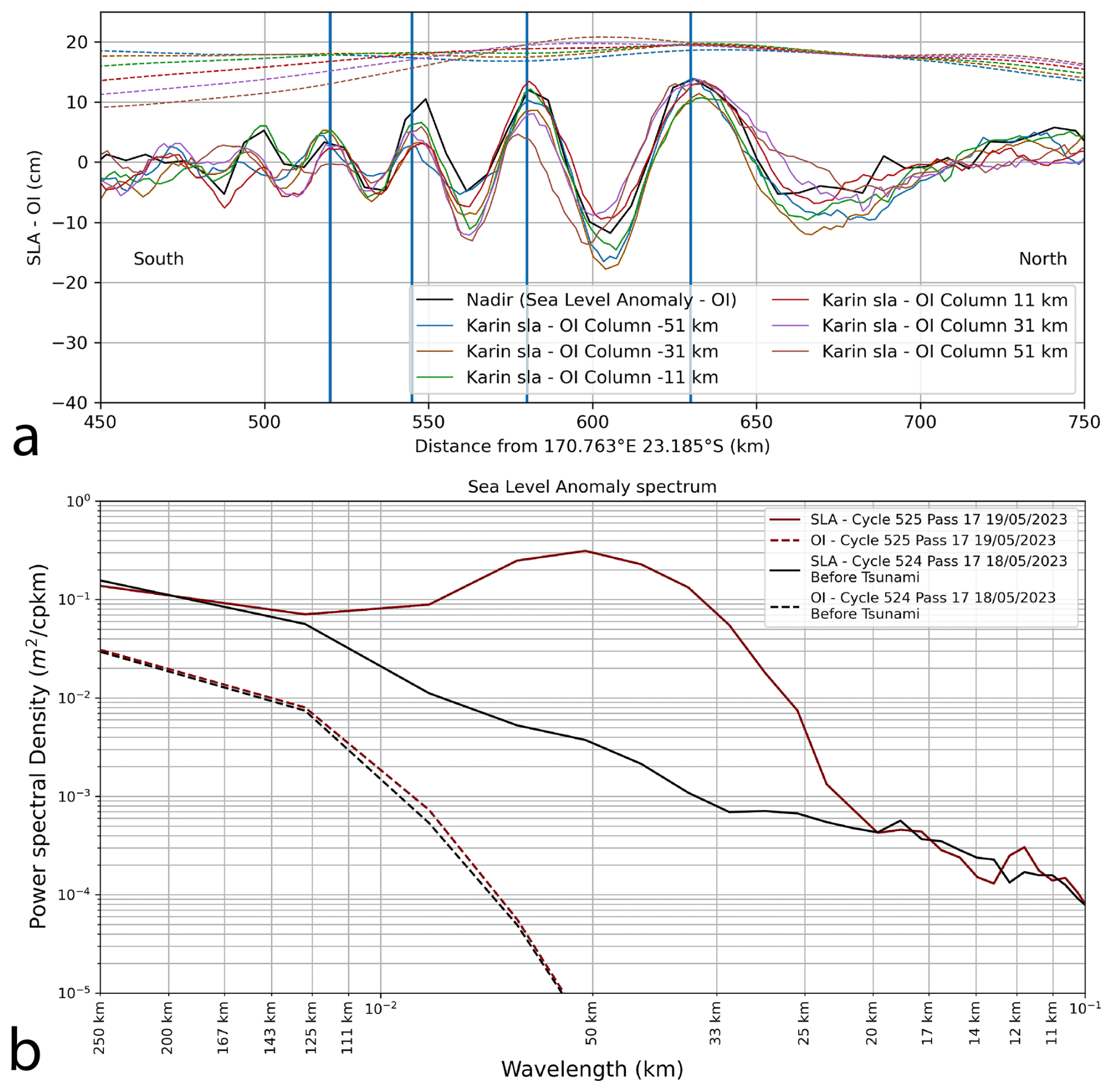 Figure 3a focuses on the North Front wave showing 1D along-direction profiles of both the Nadir and swath SLA (KaRIn instrument). Several profiles are displayed, for different track distances, at ±51, 31 and 11 km, on either side of the Nadir position. The first front wave on Fig. 3a shows the largest amplitude up to 15 cm, and the largest wavelength of more than 100 km. Moving closer to the epicenter, thus later in the propagation pattern (toward the left of the figure), the amplitude and the wavelength decrease to a few cm and a few tens of km, respectively. This is expected as the short wavelengths travel slower than the longer wavelengths due to tsunami frequency dispersion. Figure 3b shows the spectral analysis of SWOT SLA over the same area for 18 and 19 May. A large energy lobe is clearly visible at wavelengths between 20 and 120 km documenting the strong dispersive property of the tsunami signal. The optimal interpolation (OI) removed for each profile (before and during tsunami) shows similar spectrums (PSD). It is important to remove mesoscale ocean variability (but also gyres and other potential large structures) to avoid confusing their signatures with tsunami signature. Mesoscale signature could be higher than tsunami amplitude (not the case for the signal at latitude of 18° S). Difference of signal with OI removed or not is visible on Fig. 2 between Fig. 2b and c.