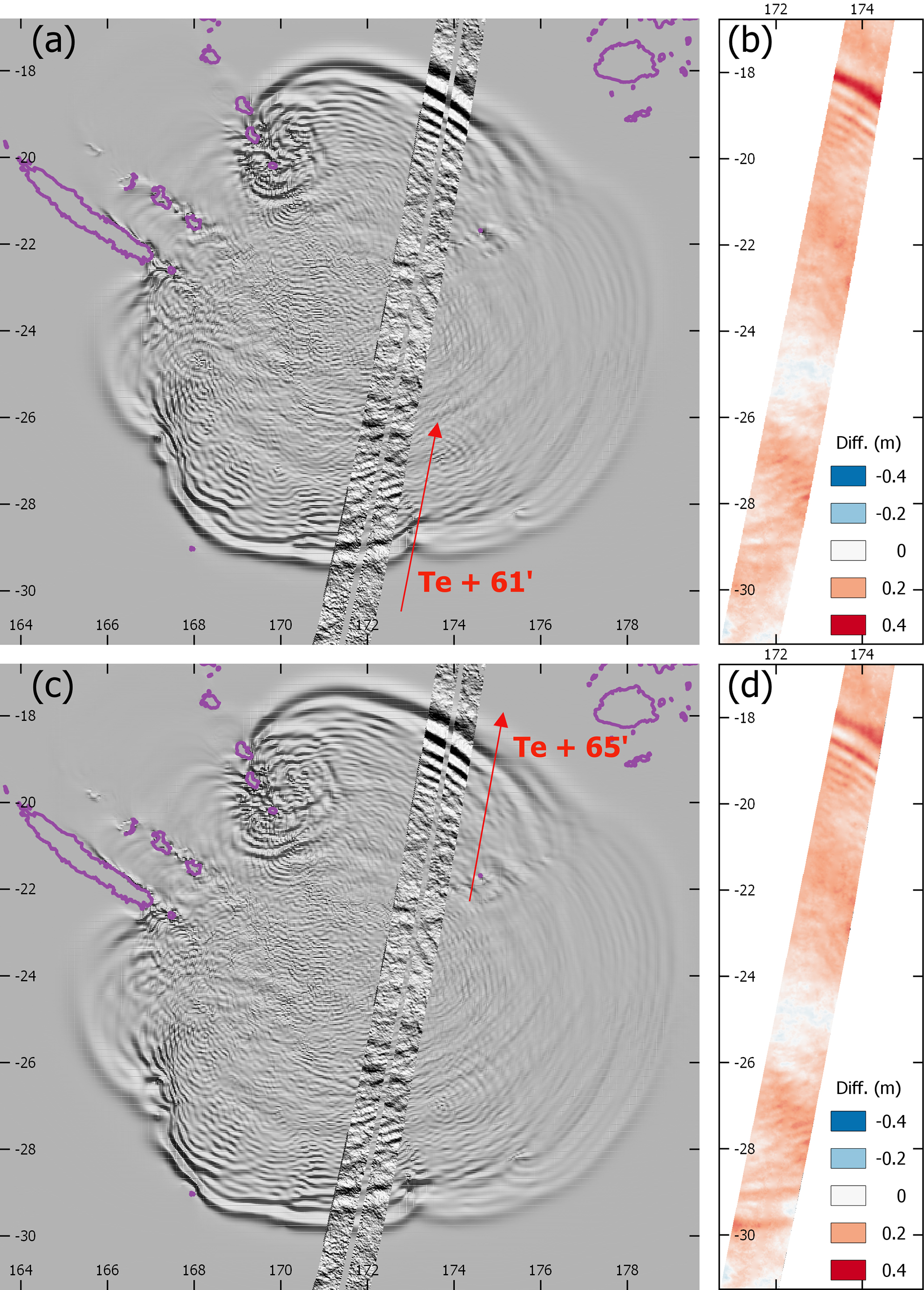 Figure 4Superposition of the SWOT satellite swath (KaRIn; presented on Fig. 2) with the simulated tsunami propagation wavefield using the GCMT-based scenario of coseismic rupture from Roger et al. (2025) at (a) T0=Te+61 min (61 min after earthquake occurrence time Te) and (c) T1=Te+65 min; (b, d) sea-surface elevation differences between SWOT record and the modelling output. The red arrows symbolize the direction of the swath measurement.