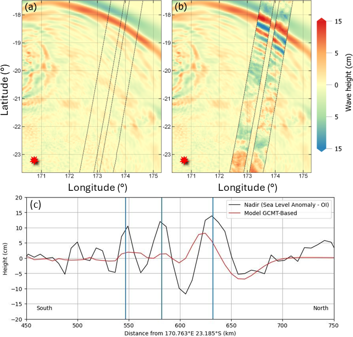 Figure 5Comparison between Nadir SWOT measurements and the model estimation cross-section at T1: (a) GCMT-based wavefield model only showing the position of SWOT measurement (dashed lines), (b) SWOT measurement superimposed on the simulated wavefield, (c) SWOT and model comparison along the Nadir. Blue vertical lines symbolize the dashed distance circles visible on Fig. 2. Red stars locate the epicenter in panels (a) and (b).